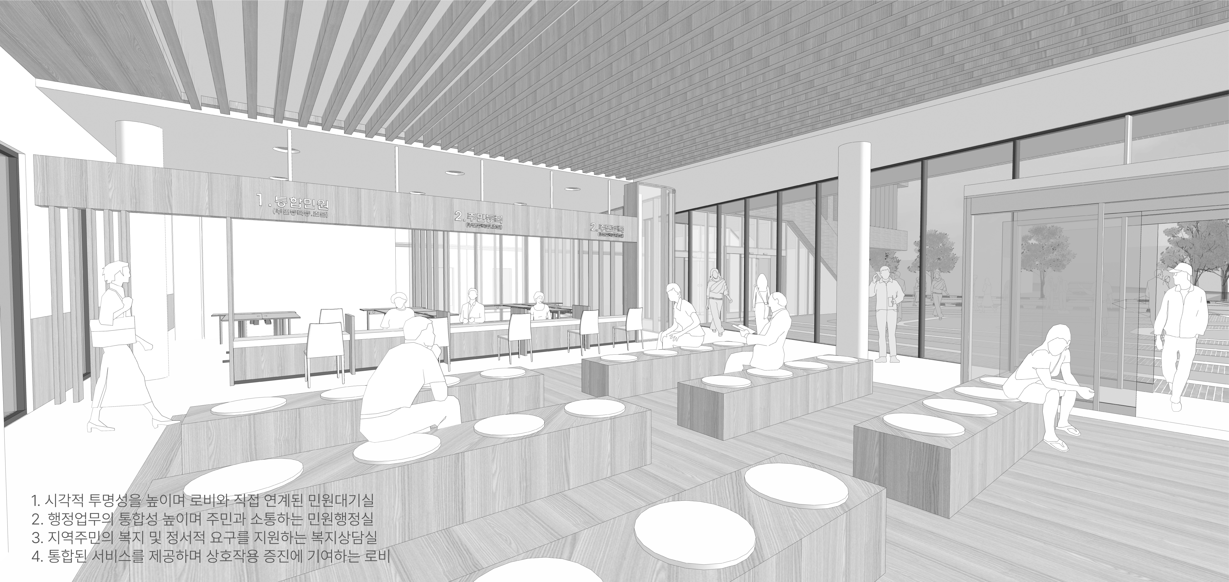 1층(민원 및 업무): 로비와 직접 연계된 민원실은 주민들에게 투명하고 편리한 행정 서비스를 제공합니다.