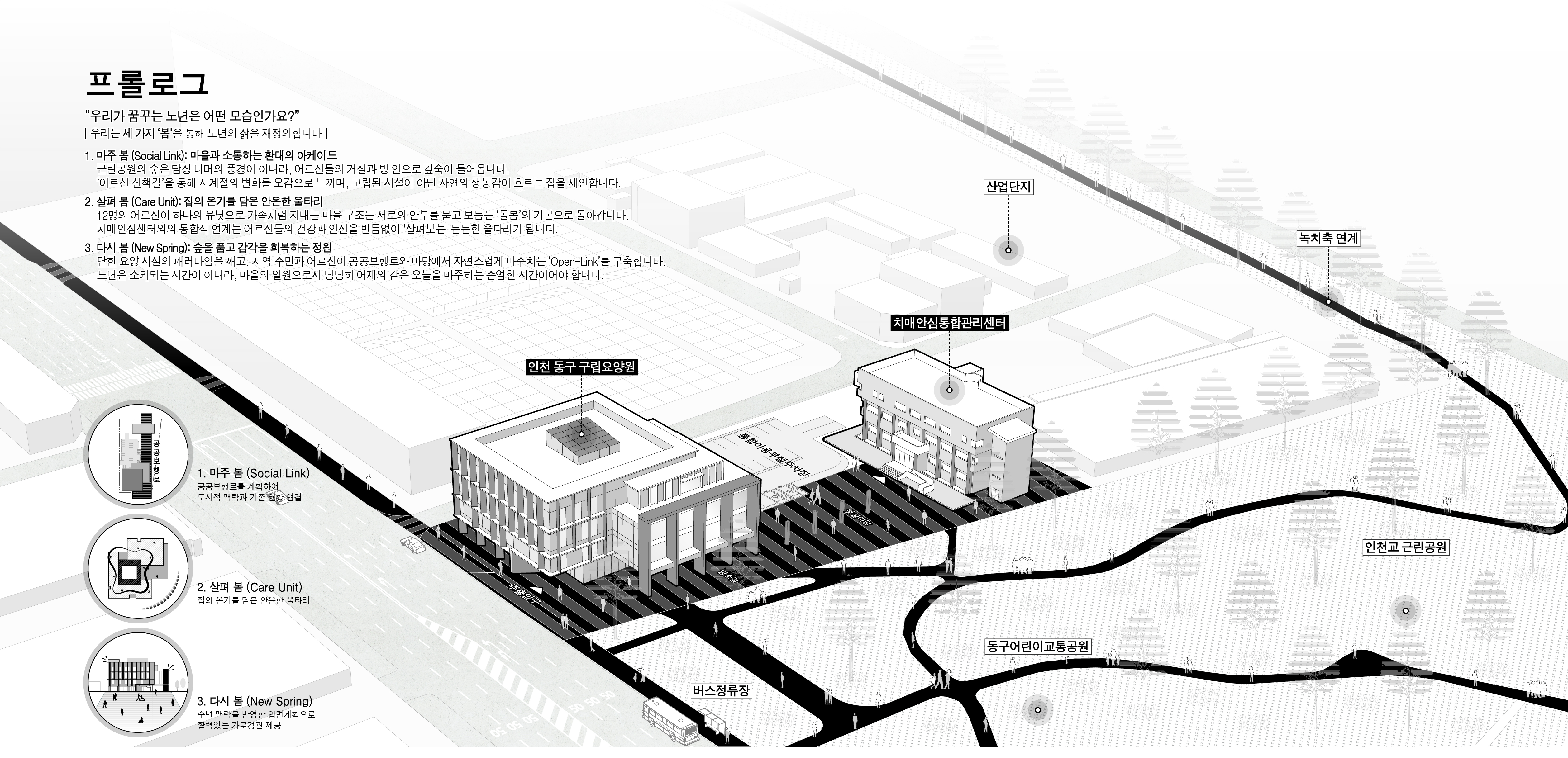 인천 동구 구립요양원은 삭막한 공업지역에 온기를 불어넣는 소셜 엔진(Social Engine)’이다. 단순히 격리된 보호 시설을 넘어, 기존 치매안심센터와 공원을 잇는 ‘케어 캠퍼스’를 구축하였다. 동구 구립요양원은 돌봄의 종착지가 아닌, 세상과 다시 눈을 맞추며 찬란한 일상을 이어가는 ‘우리집’이다.