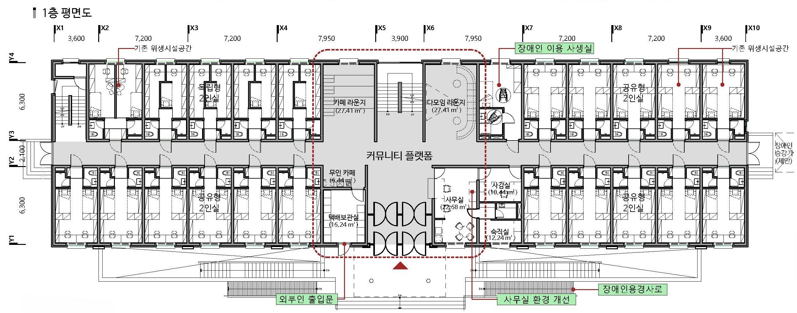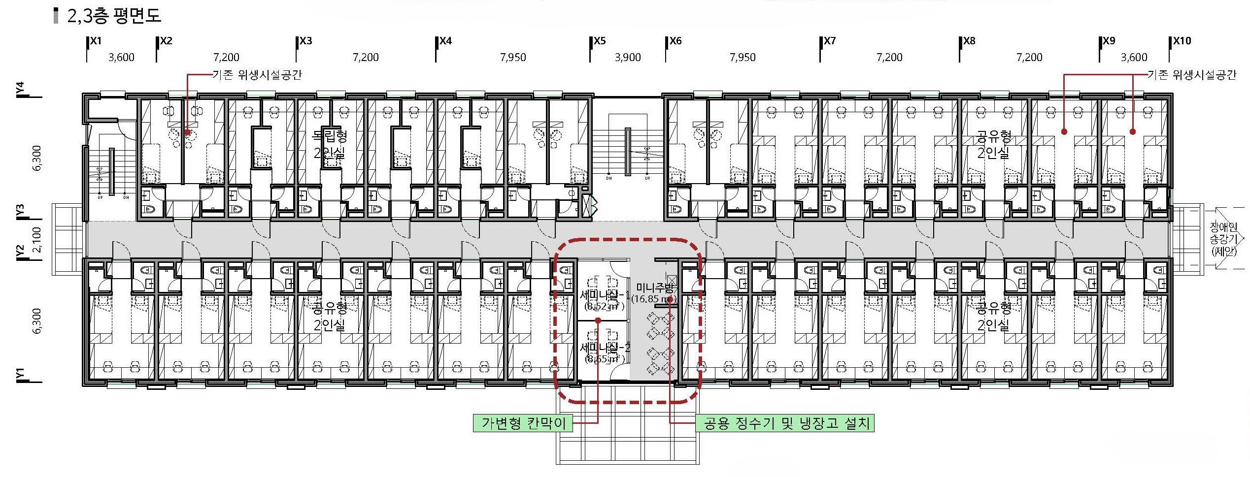 최근 학생 주거문화는 개별성과 독립성을 중시하는 방향으로 변화하고 있다. 이에 대응하여, 1인실처럼 사용할 수 있는 2인실을 계획하여 공동생활과 개인 프라이버시를 동시에 충족하는 주거 환경을 제안한다.