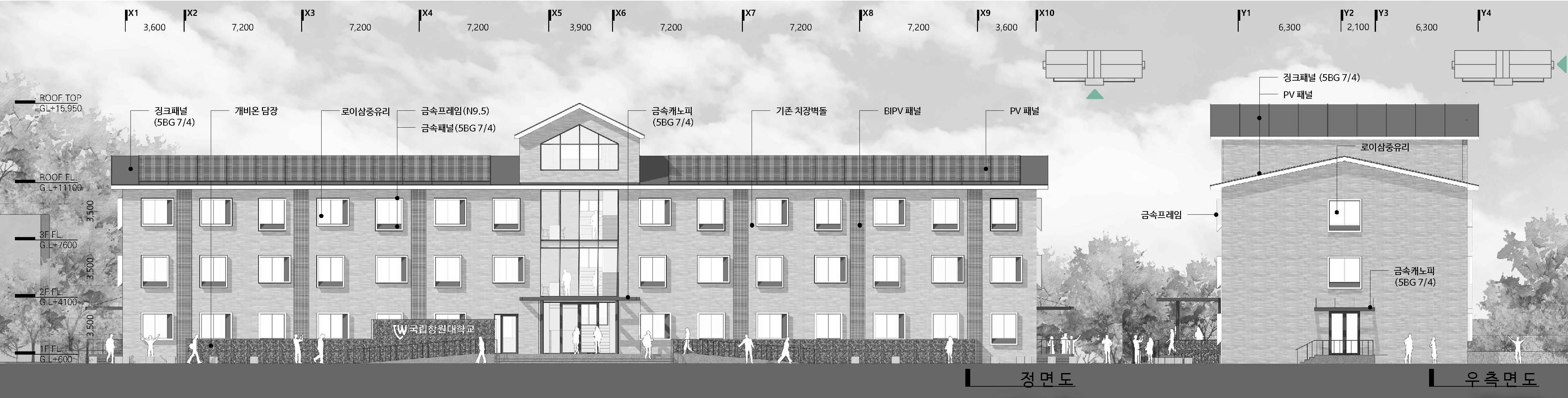 남해의 푸른 바다를 유영하는 물고기들의 역동적인 생명력을 건축적 언어로 재해석한다. 생활관 학생 개개인의 고유한 개성을 서로 다른 규격과 형태의 창호로 치환하고, 이를 입면에 반영함으로써, 단조로운 기존 건물에 입체적 리듬을 부여한다. 또한 옥빛(5BG 7/4) 계열의 색채를 적용하여 지역의 풍경과 정서를 건축에 반영한다.