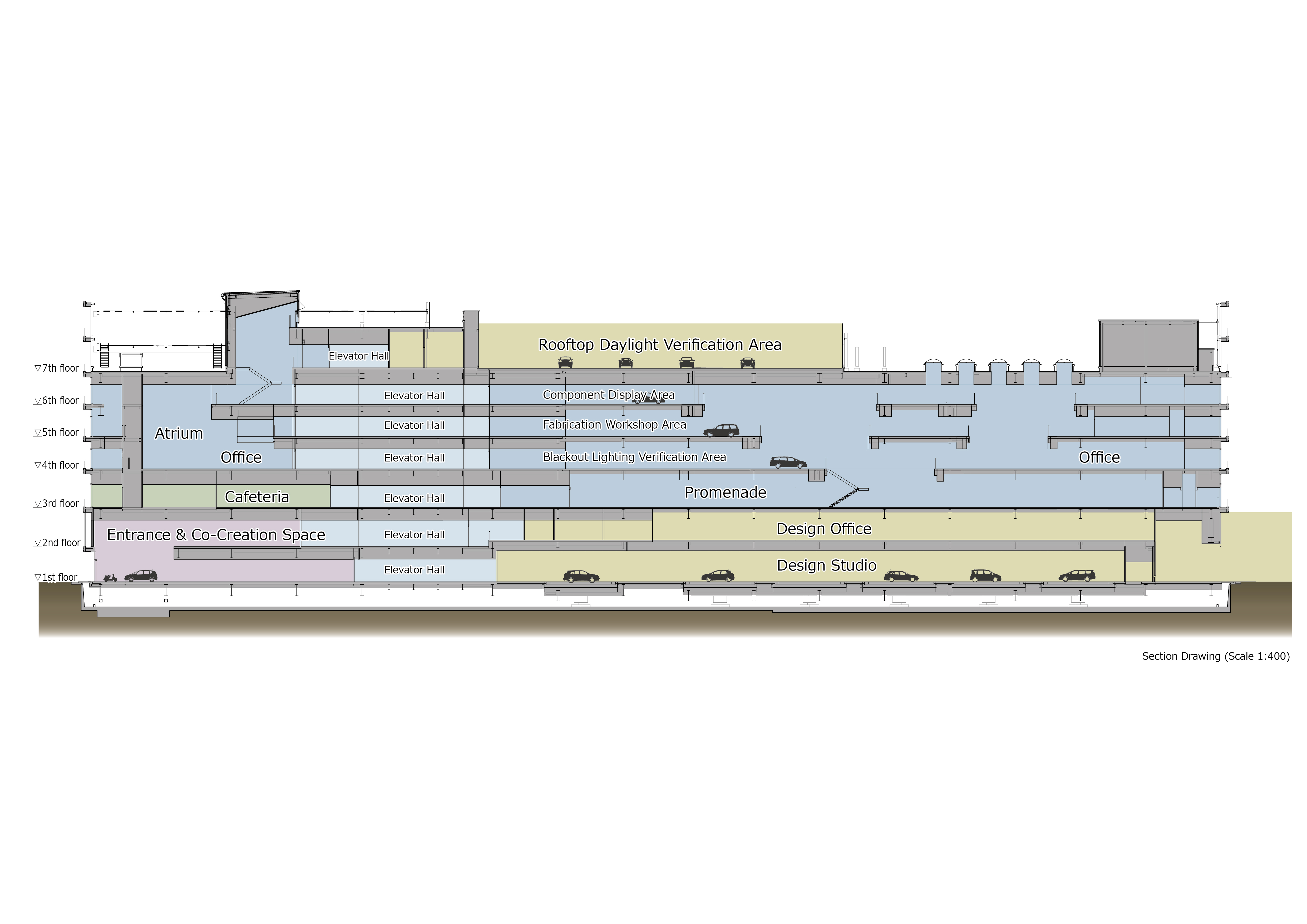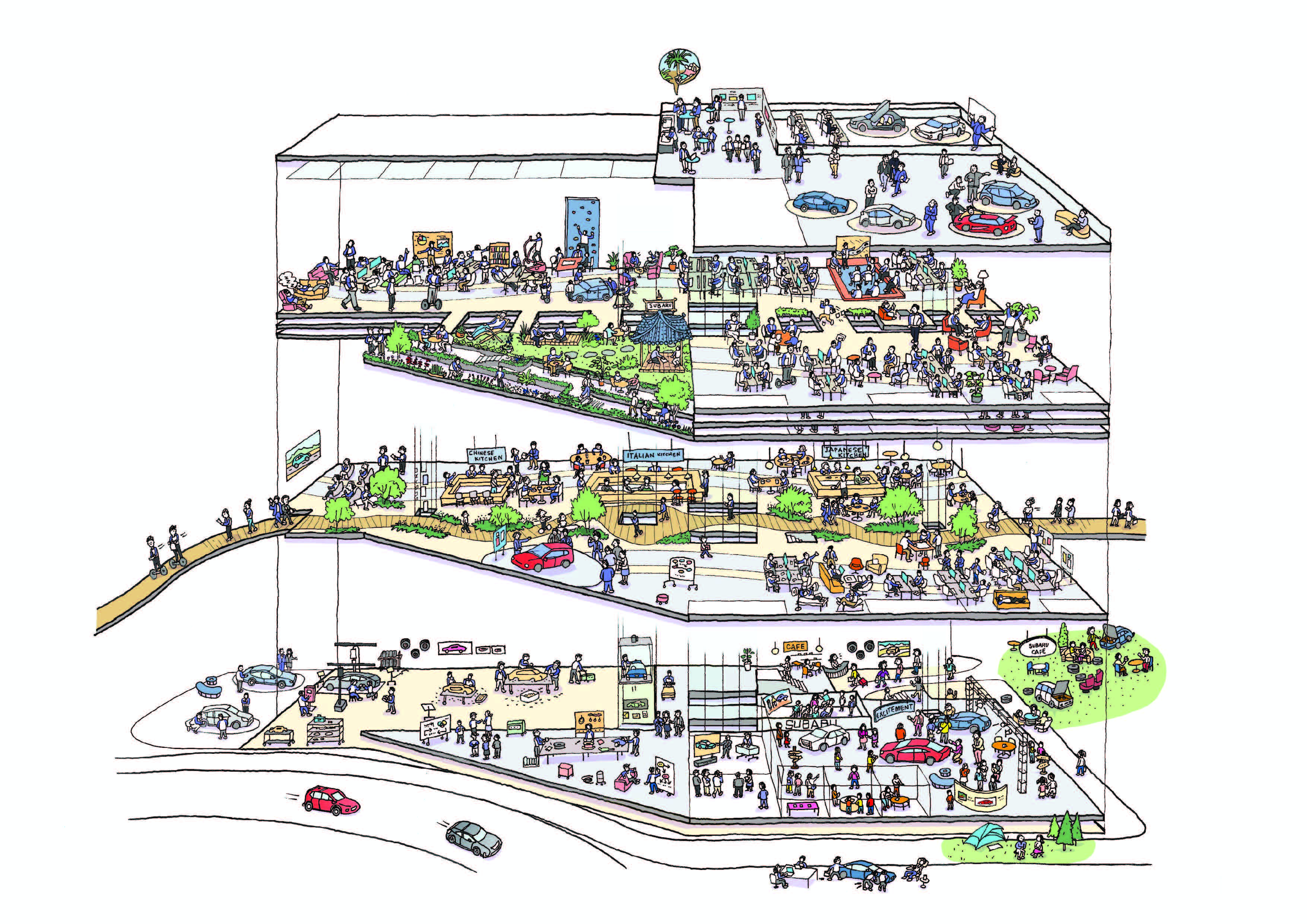 본 건물은 설계자와 기술자의 워크스페이스뿐만 아니라, 사내외 공동 가치 창조 공간, 디자인 스튜디오 등을 갖춘 스바루의 제조 역량의 핵심 시설이다. 저층부에는 사내외 공동 창조 공간, 홀·회의실, 식당 등 외부에 개방된 기능을 배치하여, 방문객이나 보안 레벨이 상이한 타 부서 직원들을 공동 조의 파트너로 자연스럽게 맞이할 수 있도록 하였다. 거의 모든 공간에 실차나 실물 크기 모델을 반입할 수 있어, 방문객과 직원동  파트너 간의 커뮤니케이션 중심에 항상 ‘물’이 개입할 수 있도록 계획하였다.