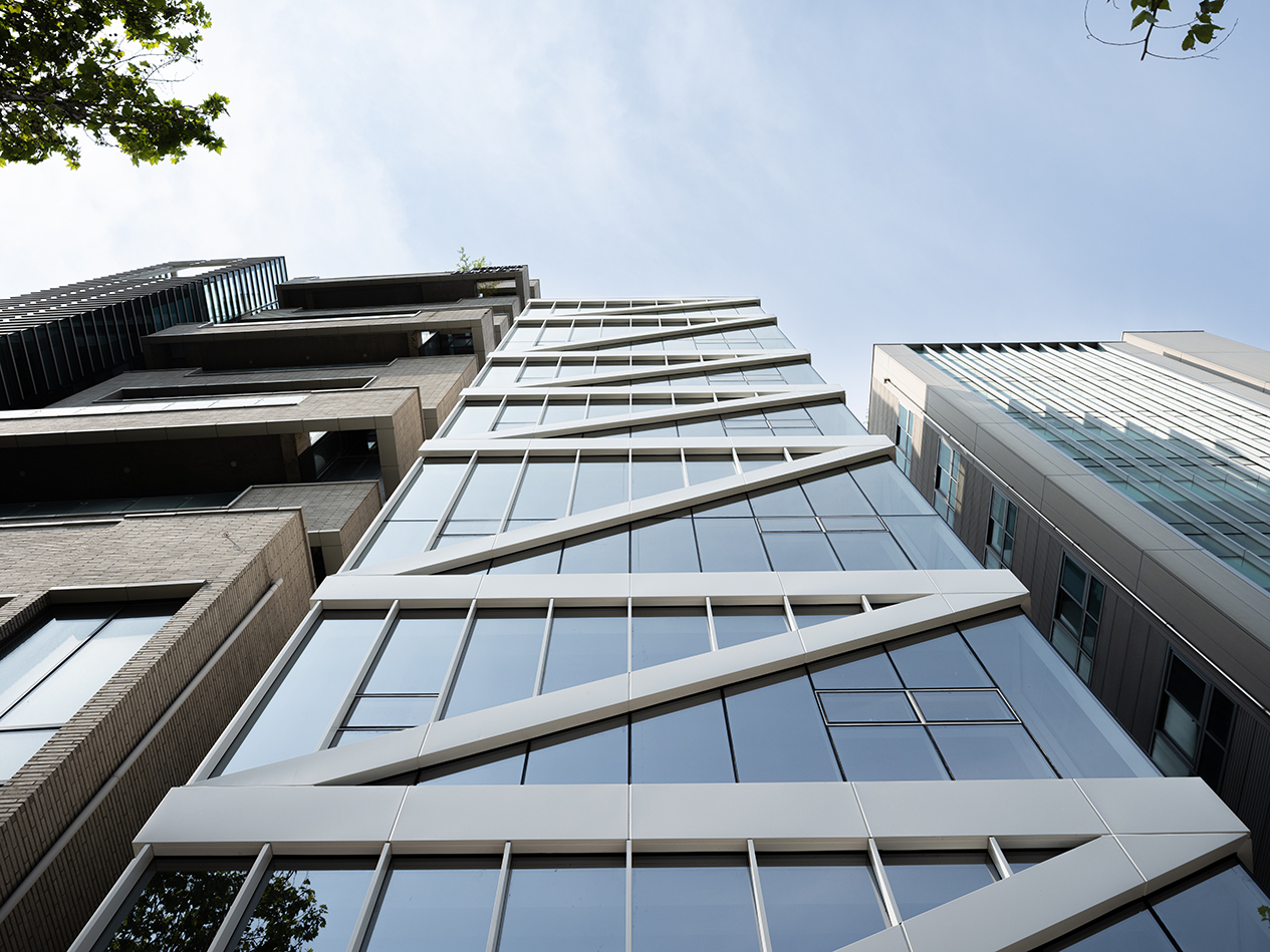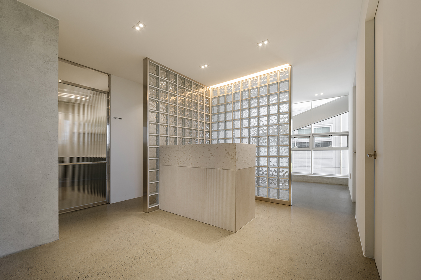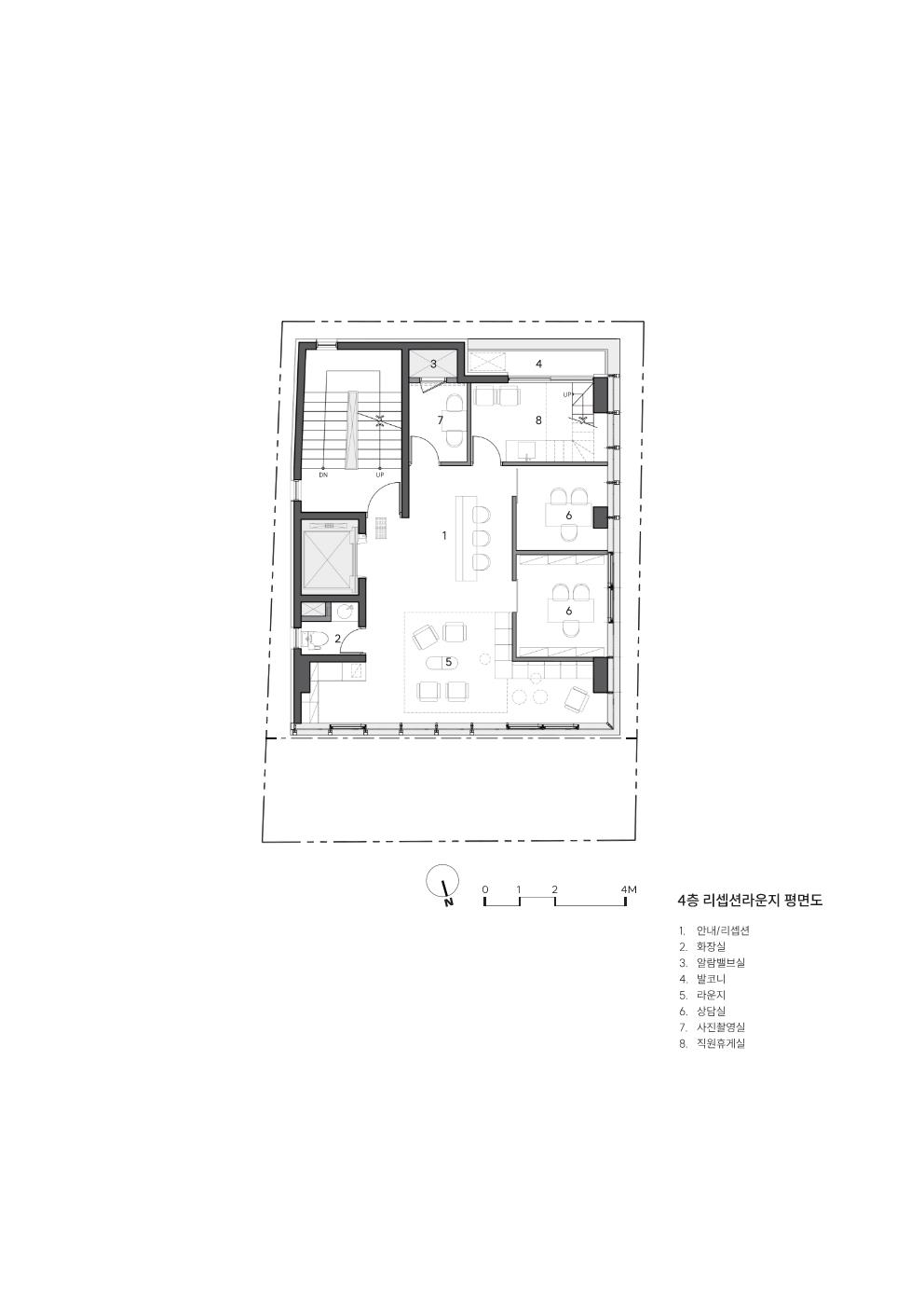 협소한 대지 조건으로 인해 1층은 필로티 주차 공간을 제외하면 승강기 홀과 계단만을 배치할 수 있어, 주요 리셉션 공간은 4층에 배치했다. 리셉션은 높은 층고로 계획해 이용자가 창을 통해 플라타너스와 하늘을 조망할 수 있도록 했다.