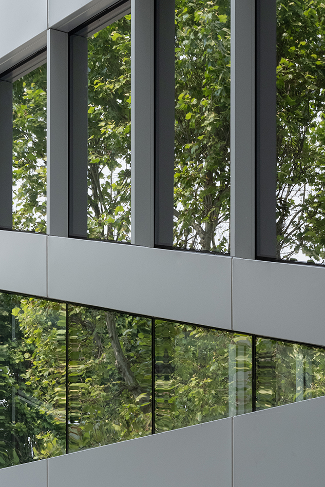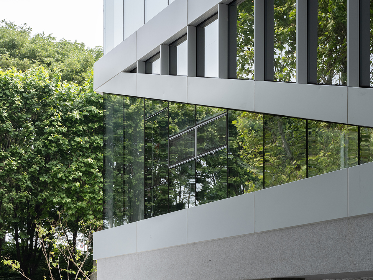 입면 디자인에서는 반복되는 수평 바와 이를 연결하는 대각선 브레이싱을 북서측 코너에 적용하여 삼각형 패턴을 형성하였다. 이 패턴은 층고 변화에 따라 리듬감을 형성하며, 북서측 방향의 열린 조망을 강조하는 동시에 상승감을 부여한다. 이는 건물의 규모를 시각적으로 확장시키고, 소규모 사옥의 존재감을 강화하는 장치로 작동한다. 내부에서는 이 삼각 브레이싱이 자연 경관을 끌어들이는 프레임으로 기능한다.