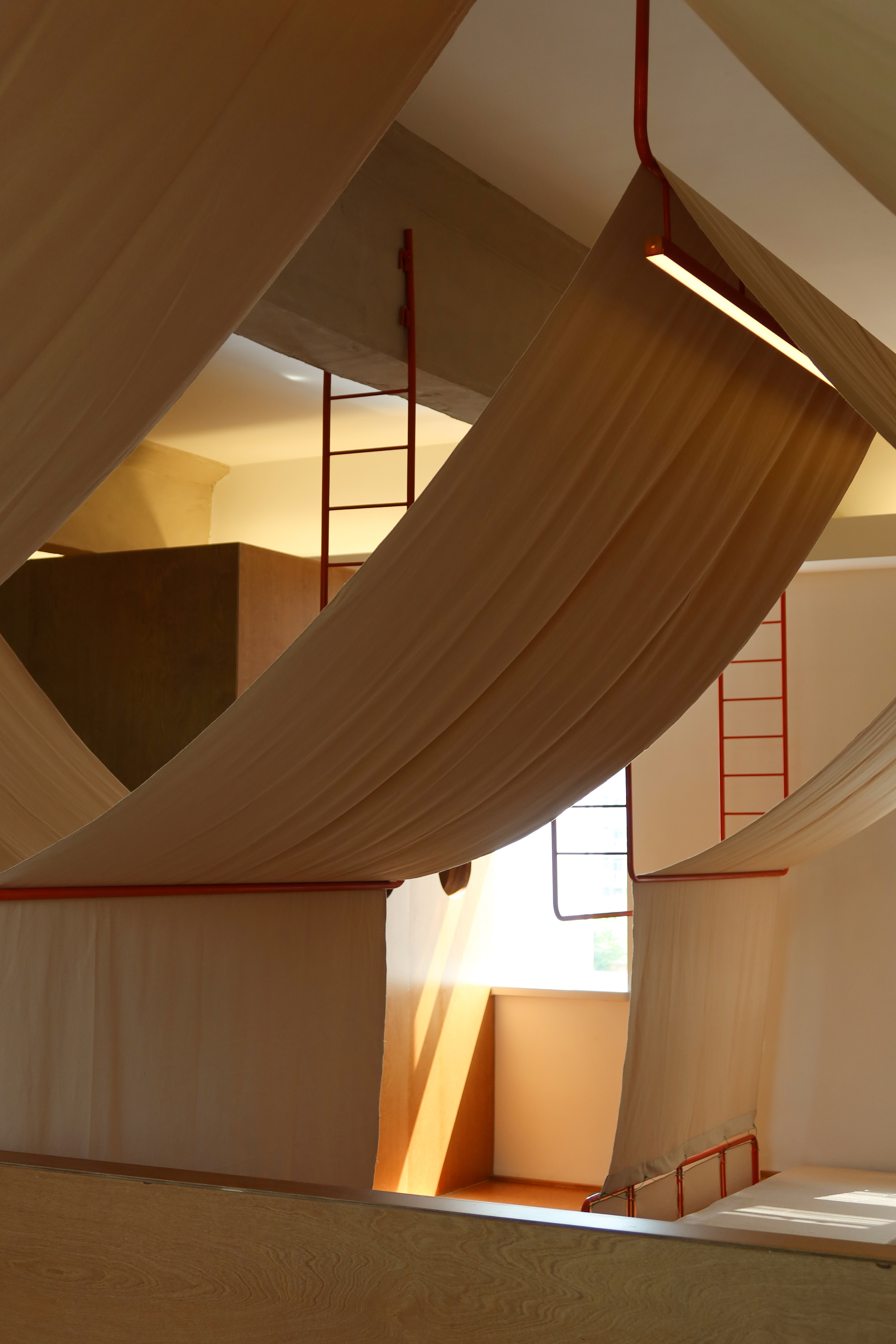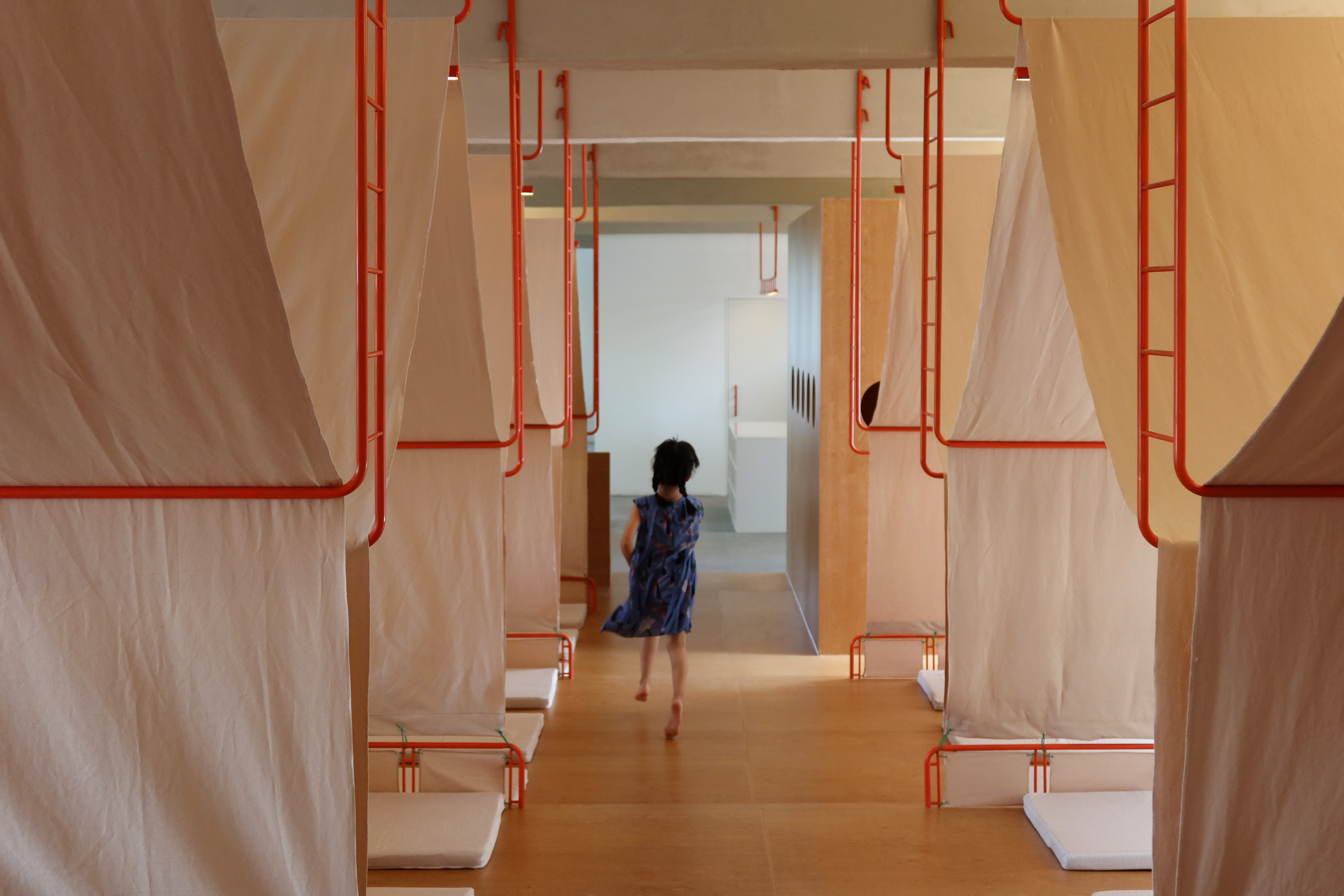 서로 다른 높이의 목재 플랫폼은 계단식 구조를 만들며 텐트들이 공간을 따라 흐르듯 배치된다. 이 단차는 자연스럽게 오르내리는 동선을 만들고, 플랫폼 가장자리는 오픈된 책장으로 활용된다. 낮에는 독서 공간으로, 점심 이후에는 낮잠을 위한 침대로 전환되며, 다기능성이 구조 자체에 내재됐다.