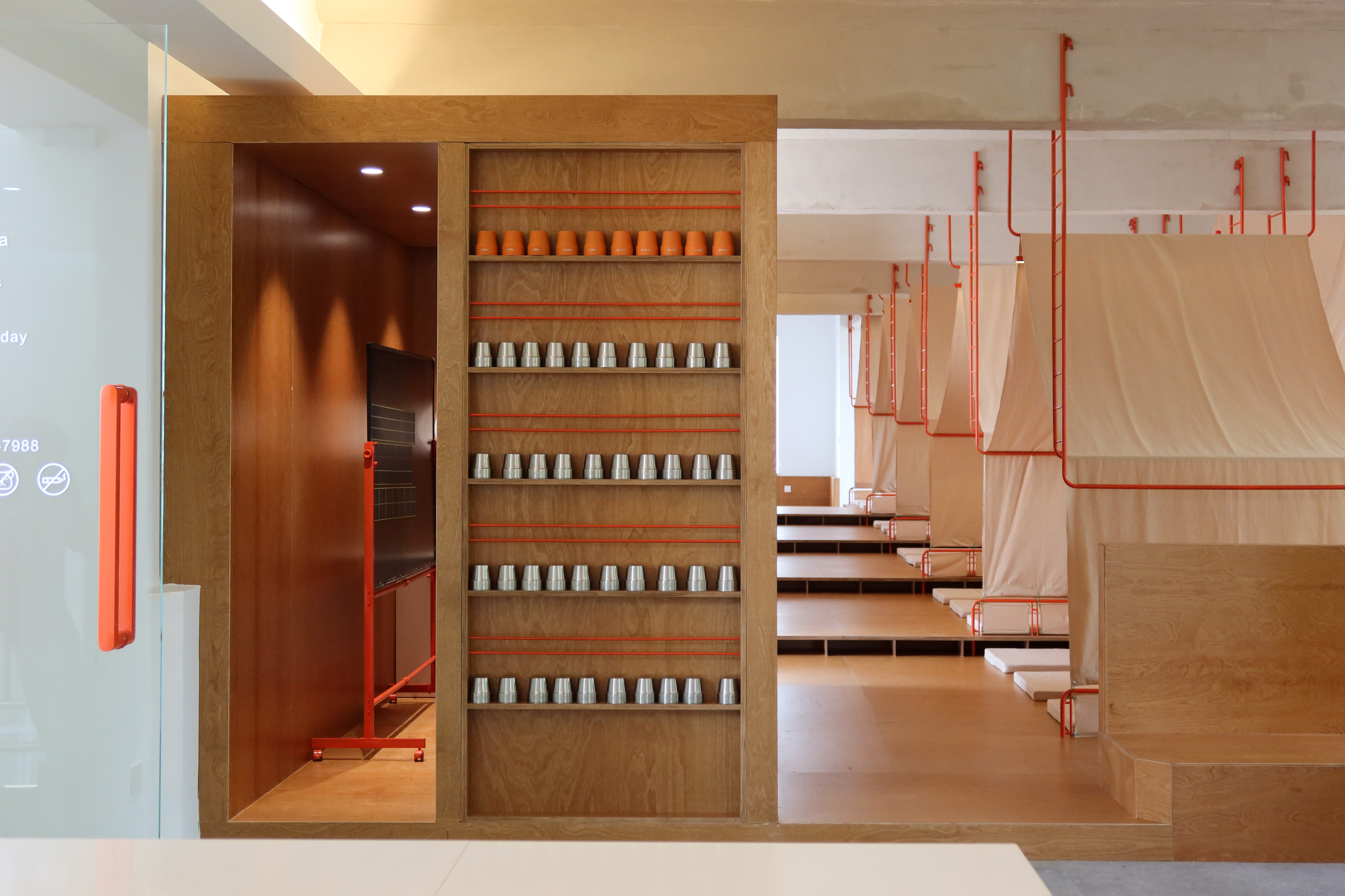 설계의 출발점은 질문이었다. 아이들이 어떻게 안전함과 소속감을 느낄 수 있을까. 전통적인 교실 구획 대신, 건축가는 텐트를 공간의 기본 단위로 설정했다. 텐트는 보호의 상징이자 탐험과 놀이의 은유다. 시판 제품은 기본 유닛으로 사용하기 어려웠기 때문에, 오렌지색 철골 프레임과 캔버스, 조명, 목재 플랫폼으로 구성된 맞춤형 텐트 시스템을 개발했다. 각각의 텐트는 읽기와 휴식이 가능한 다기능 개인 공간이 된다.