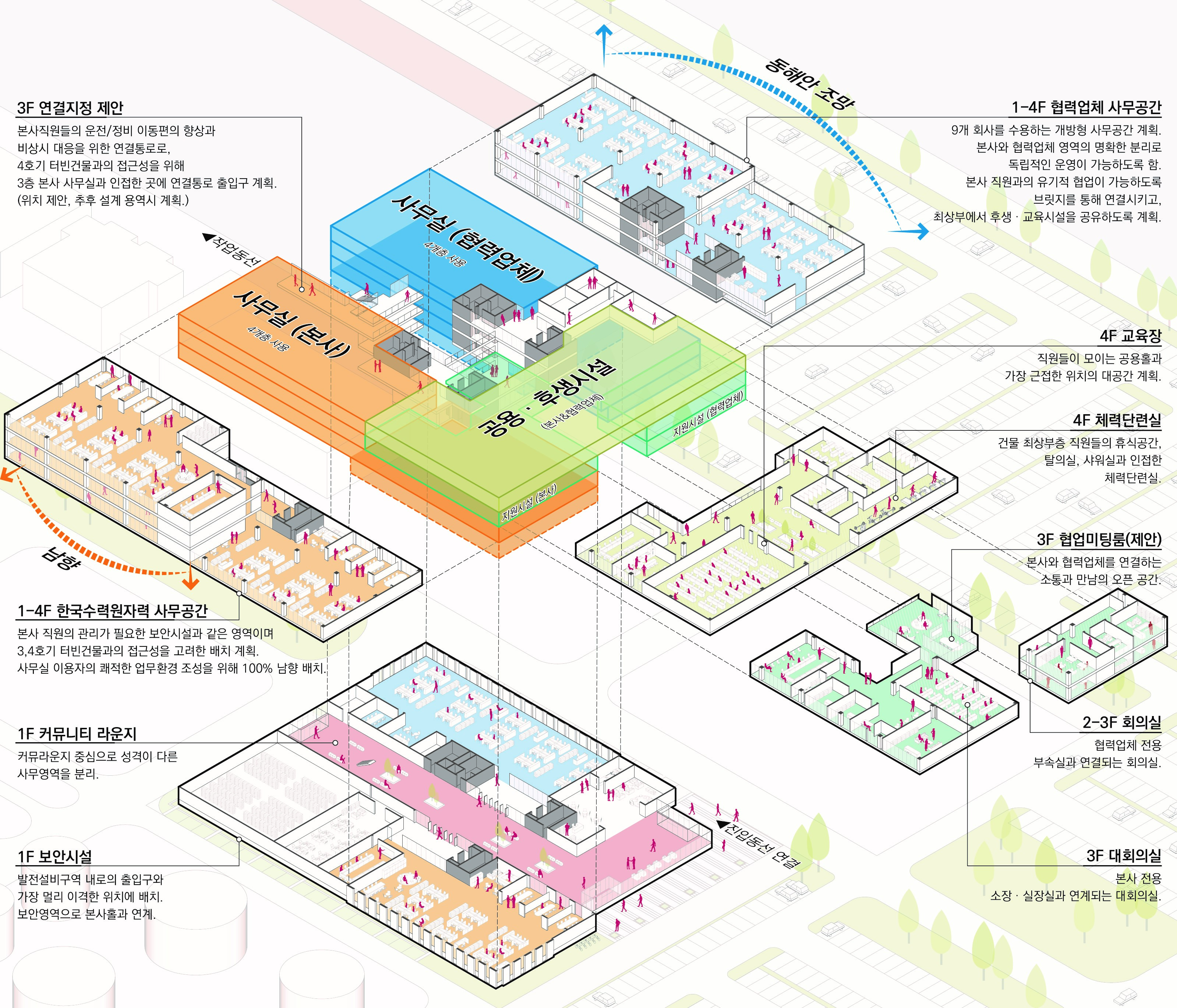 ‘공유된 경계’의 철학은 치밀한 대안 검토를 거친 최적의 기능 배치로 완성됩니다. 발전설비구역과의 최단 동선을 확보함과 동시에 실의 깊이와 향을 면밀히 분석하여 사무 환경의 질을 제고하였습니다. 특히 높은 보안 수준이 요구되는 백업통제실과 공용 영역을 수직적으로 명확히 분리(Zoning)하여, 보안성과 연계성을 동시에 확보하였습니다. 결과적으로 신한울 3, 4호기에 대한 전략적 감시가 가능한 배치를 통해 현장 대응력을 강화하고, 독립적인 동선 체계와 아트리움 중심의 유기적 협업 인프라를 통합하였습니다.