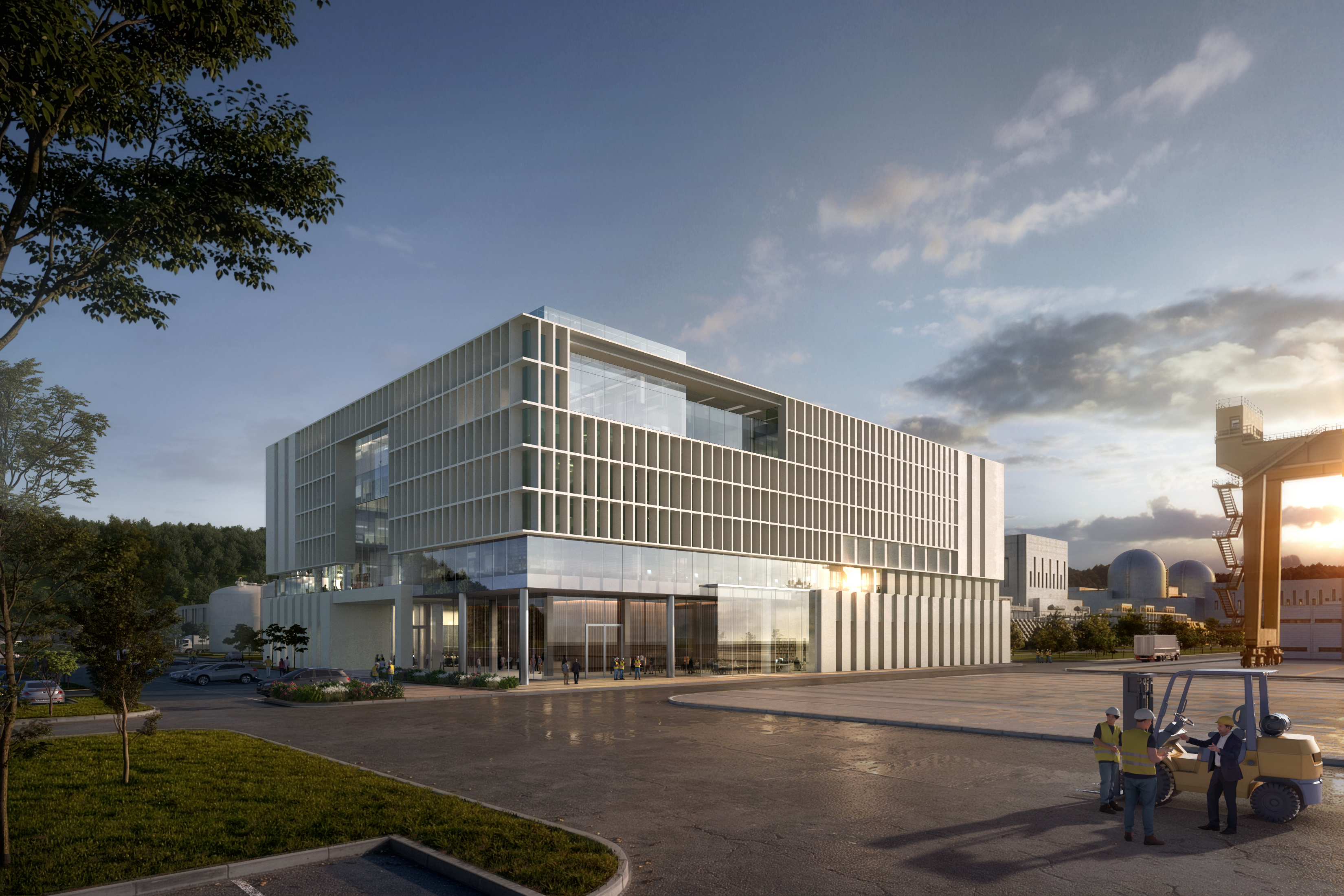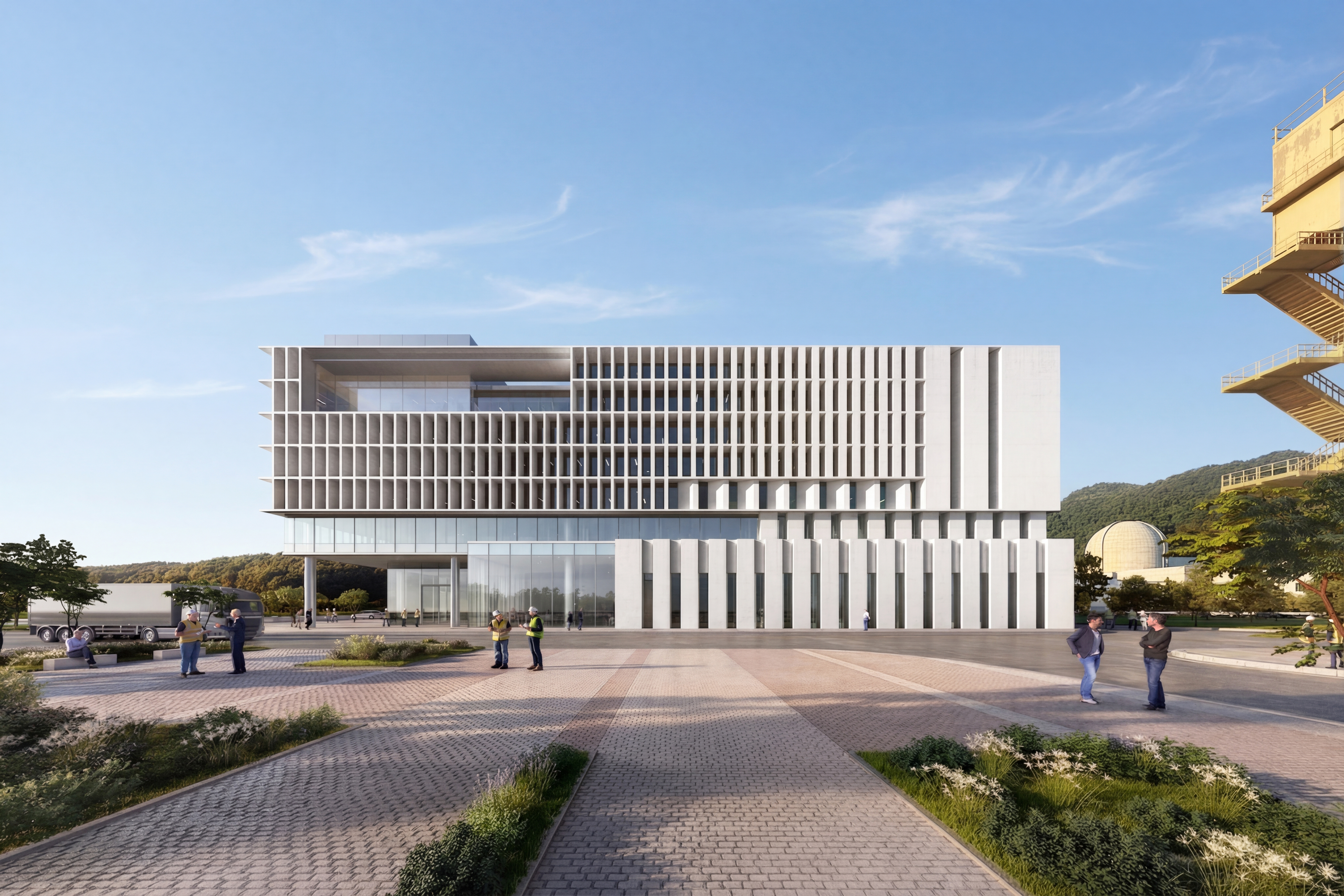 입면 계획은 대지의 맥락과 국가 핵심 시설로서의 상징성을 반영합니다. 주변 발전 설비의 거대한 스케일과 중량감에 대응하기 위해 주재료로 석재 패널을 채택하였습니다. 이는 주변 경관과의 조화를 이루는 동시에, 신한울 3, 4호기 발전소 사무동이 지녀야 할 견고함과 시각적 신뢰를 드러내는 건축적 장치가 됩니다.