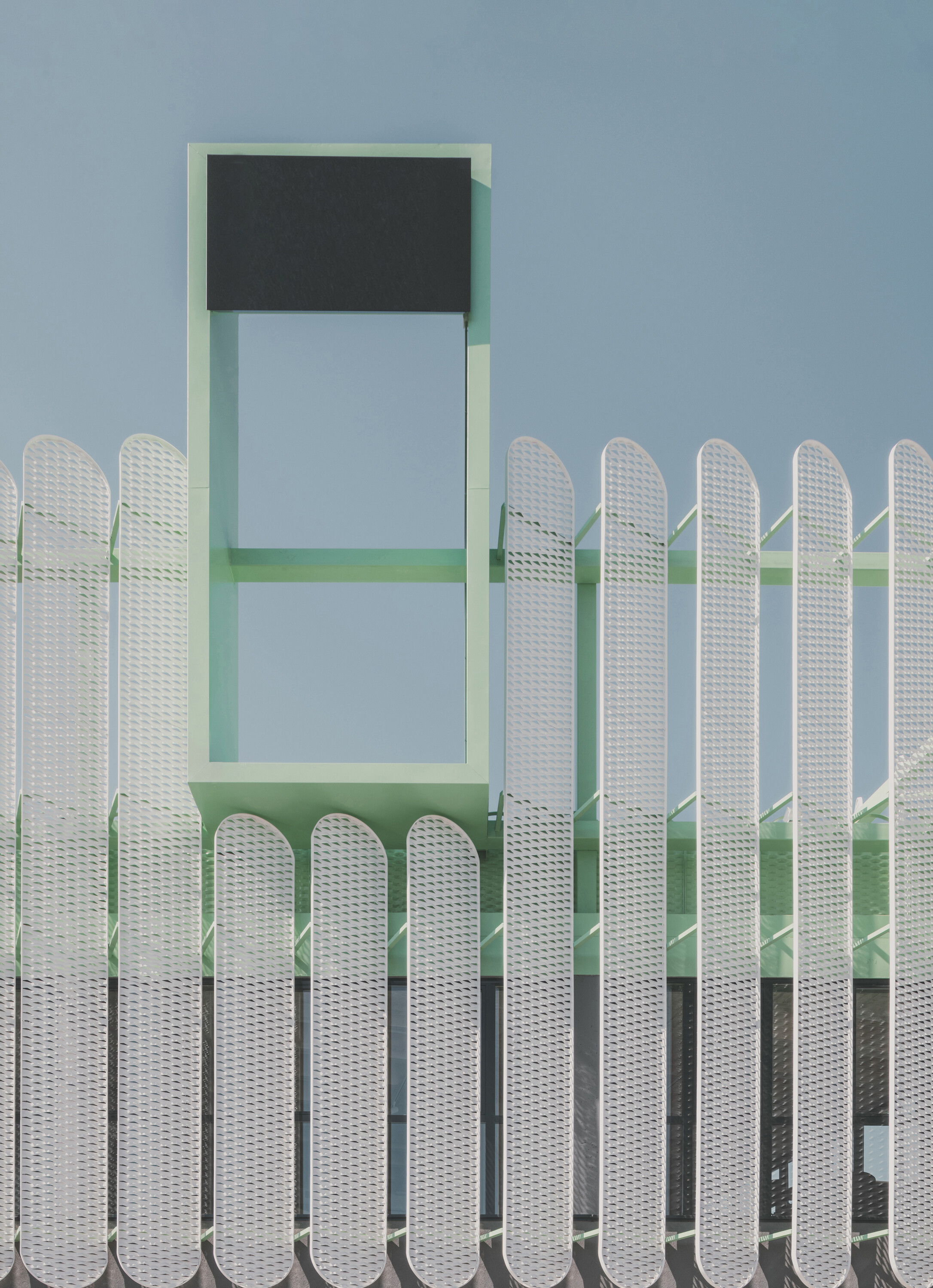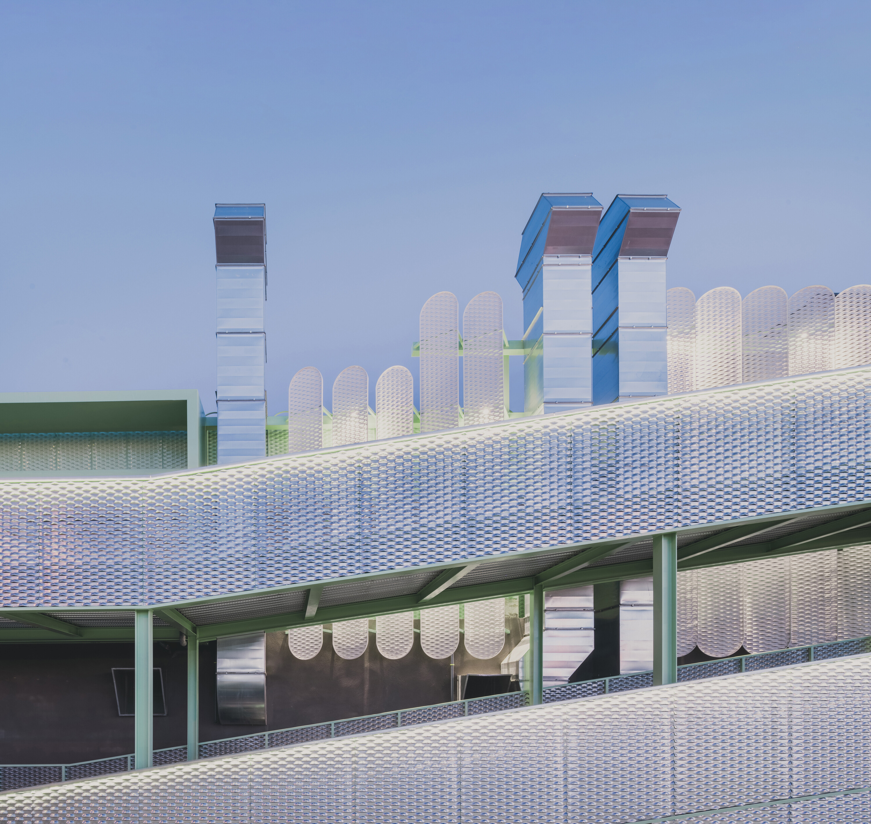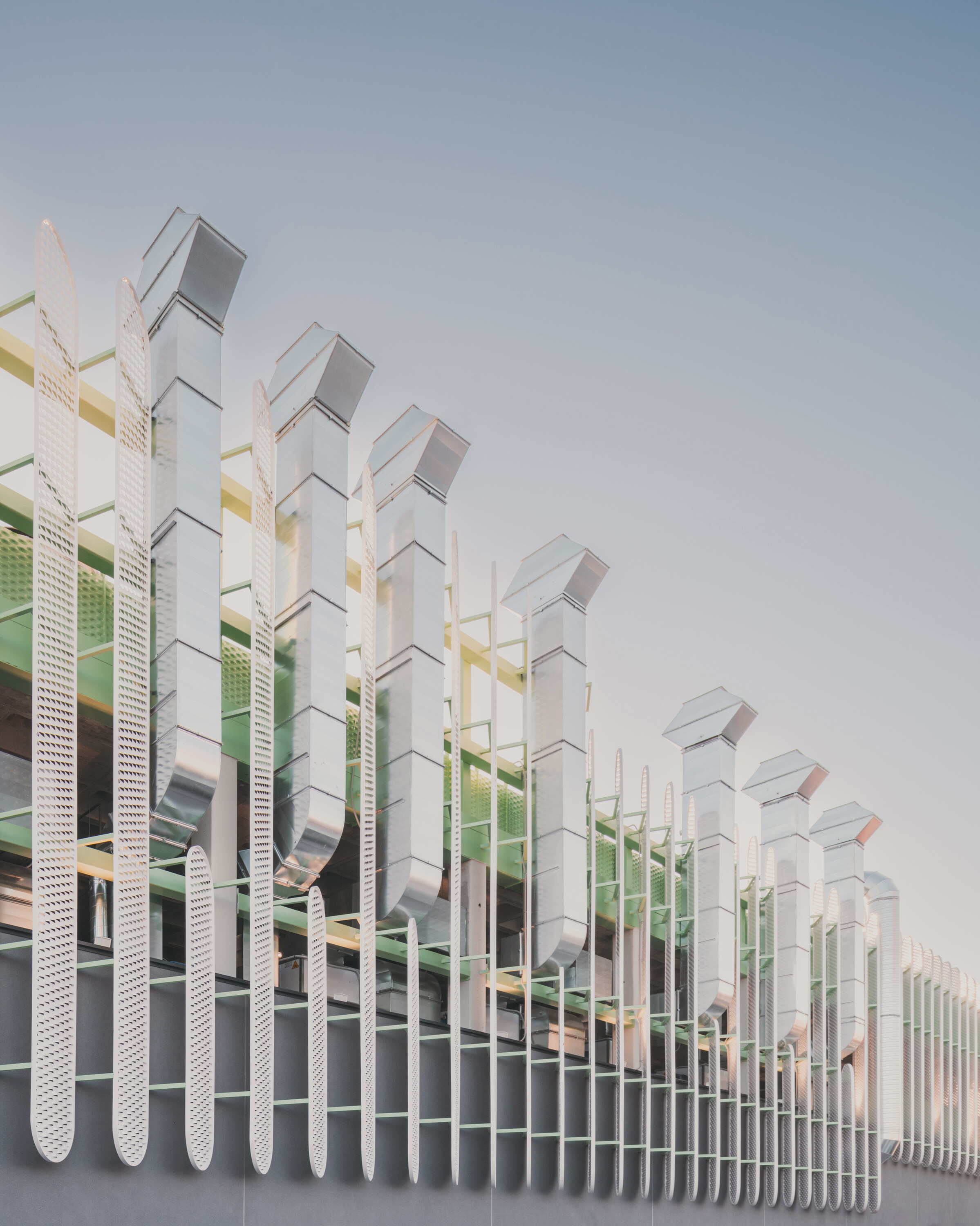 이 프로젝트에서 가장 강렬하게 느껴지는 것은 새로운 입면이다. 단열 성능이 거의 없고 존재감이 약했던 기존 벽돌 입면은 완전히 탈바꿈되었다. 구조 위에 다양한 폭의 백색 금속 슬랫을 두른 새로운 파사드는 공업적 설비 요소를 숨기지 않고 드러내는 요소로 작동한다. 기술적 요소를 드러내면서도 조형적으로 정제된 리듬을 만드는 것이다. 이 수직 슬랫은 빛을 차단하면서도 자연환기가 될 수 있도록 돕는다.