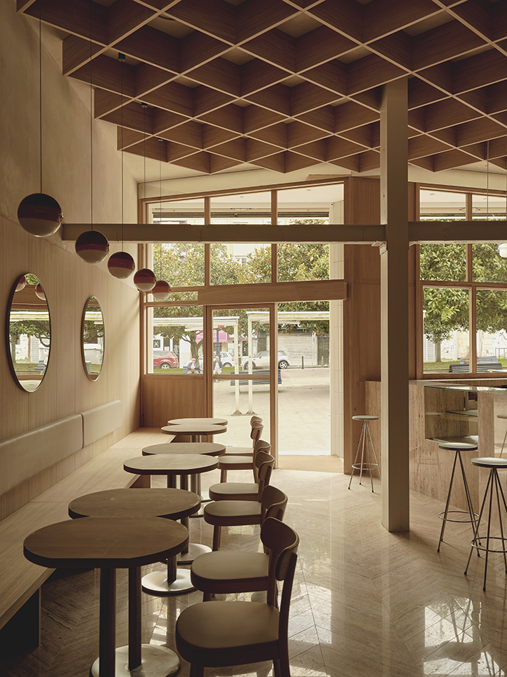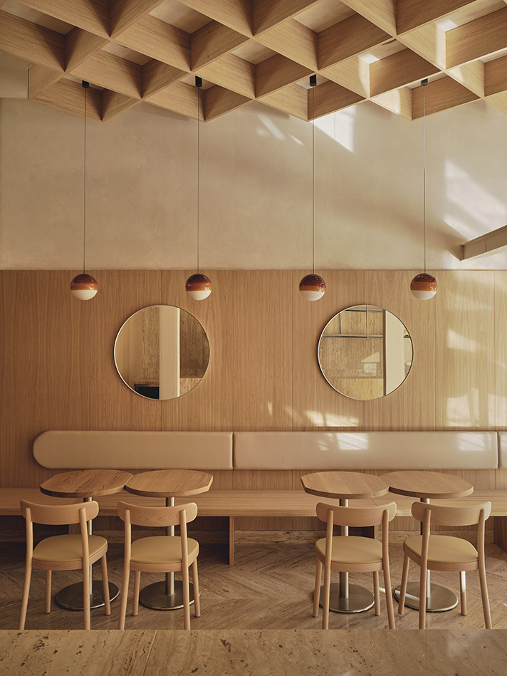 디자인은 마름모 형태의 모듈로 구성됐다. 이 도형은 천장, 바닥, 파사드에 반복적으로 적용되며 공간 전반에 일관된 리듬을 형성한다. 특히 격자형 천장 구조는 공간에 깊이감을 부여하면서 시각적 아이덴티티를 강화한다.