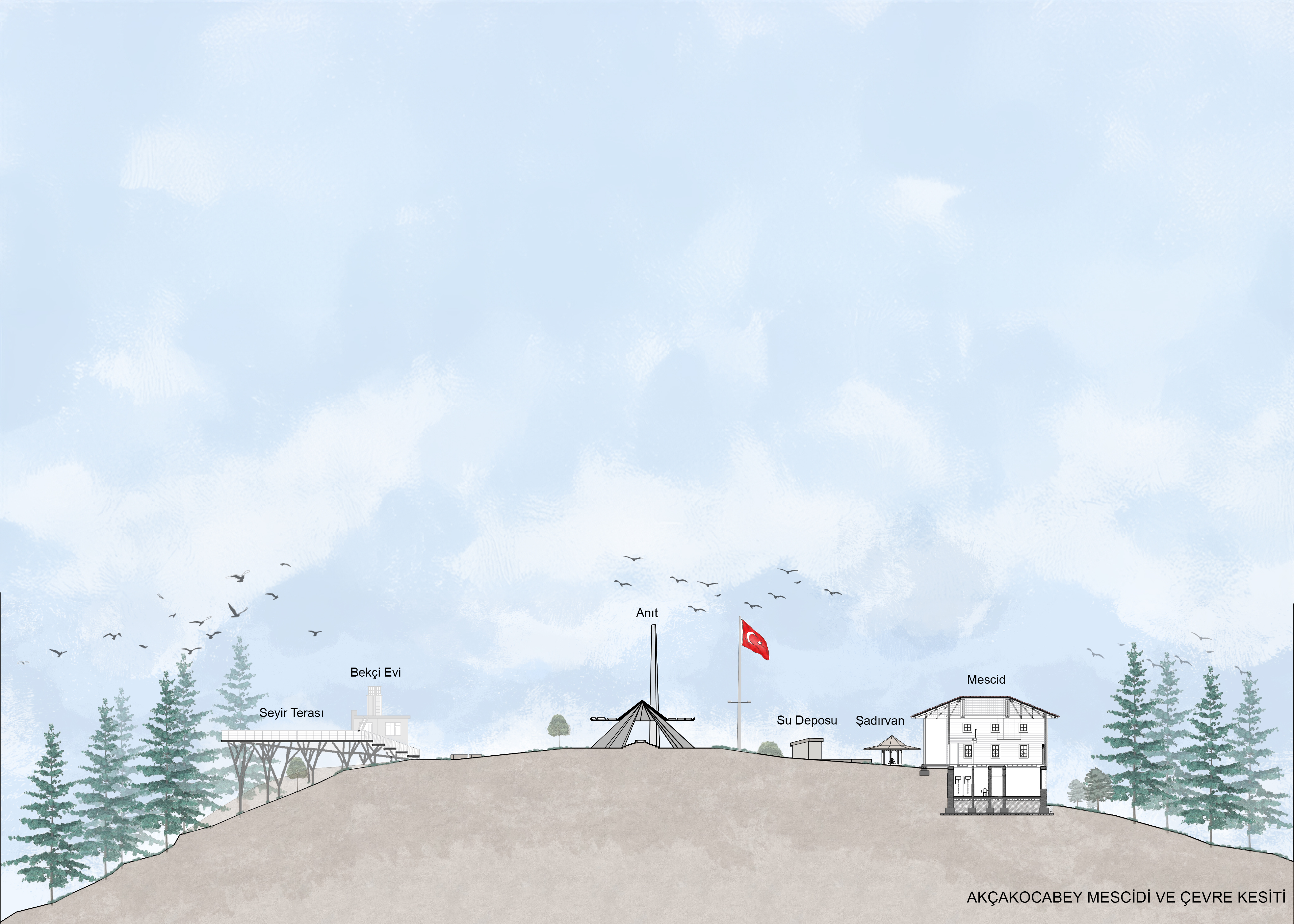 이번 프로젝트는 기존 기념물 복원과 조경 재정비 그리고 새로운 모스크를 설계하는 것이었다. 그 중에서도 가장 중요한 것은 기념물을 둘러싼 도로와 부속 구조물을 철거하고, 차량 접근을 막아 자연과 기념물이 하나의 풍경으로 통합되도록 하는 것이다. 또한 기존 모스크를 철거하고, 장소의 자연성과 종교적 의미에 조응하는 새로운 목조 모스크를 계획했다. 흑해와 고대 항구, 숲을 향해 시선을 열어주는 전망대도 함께 설계되었다.