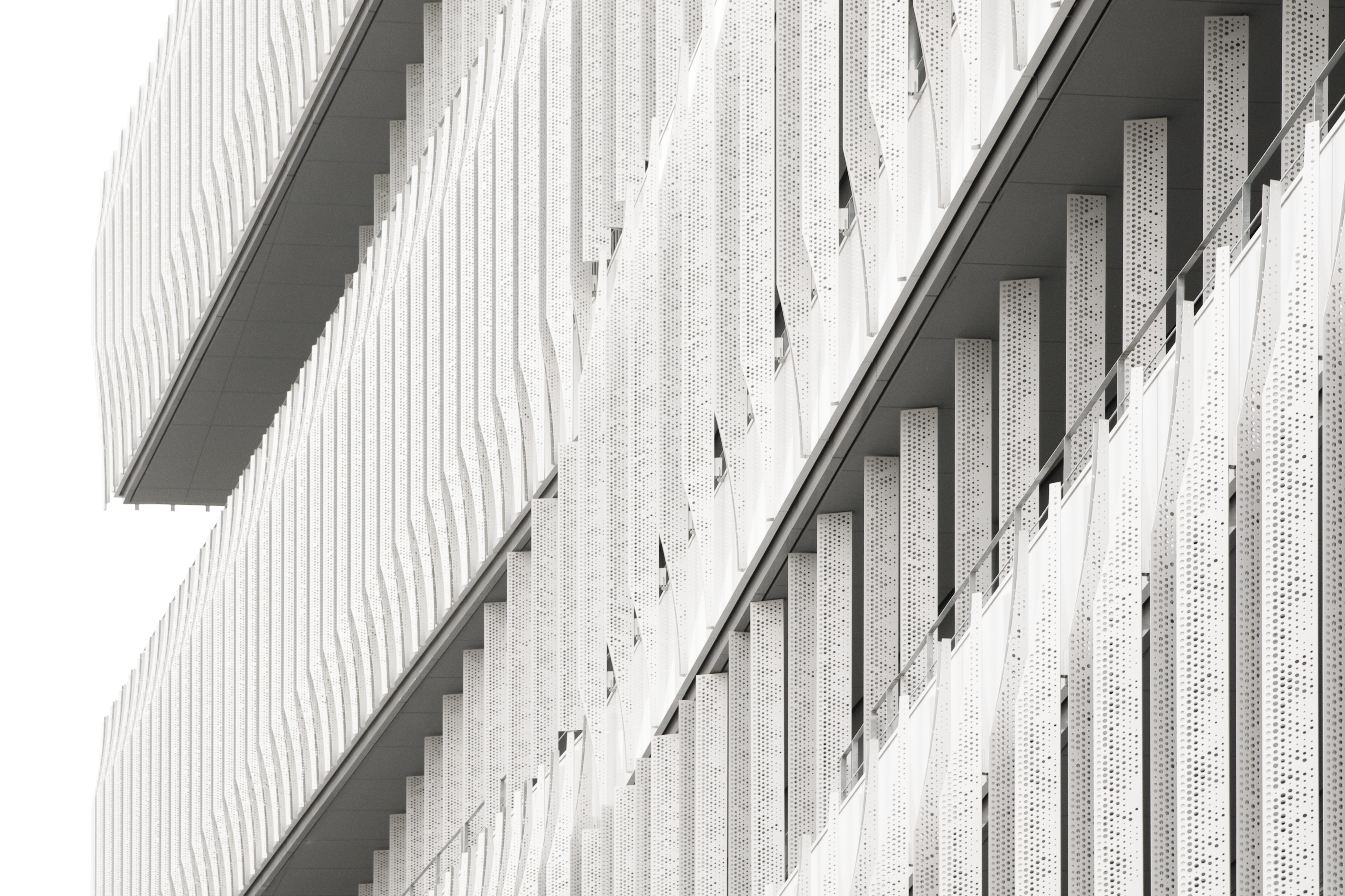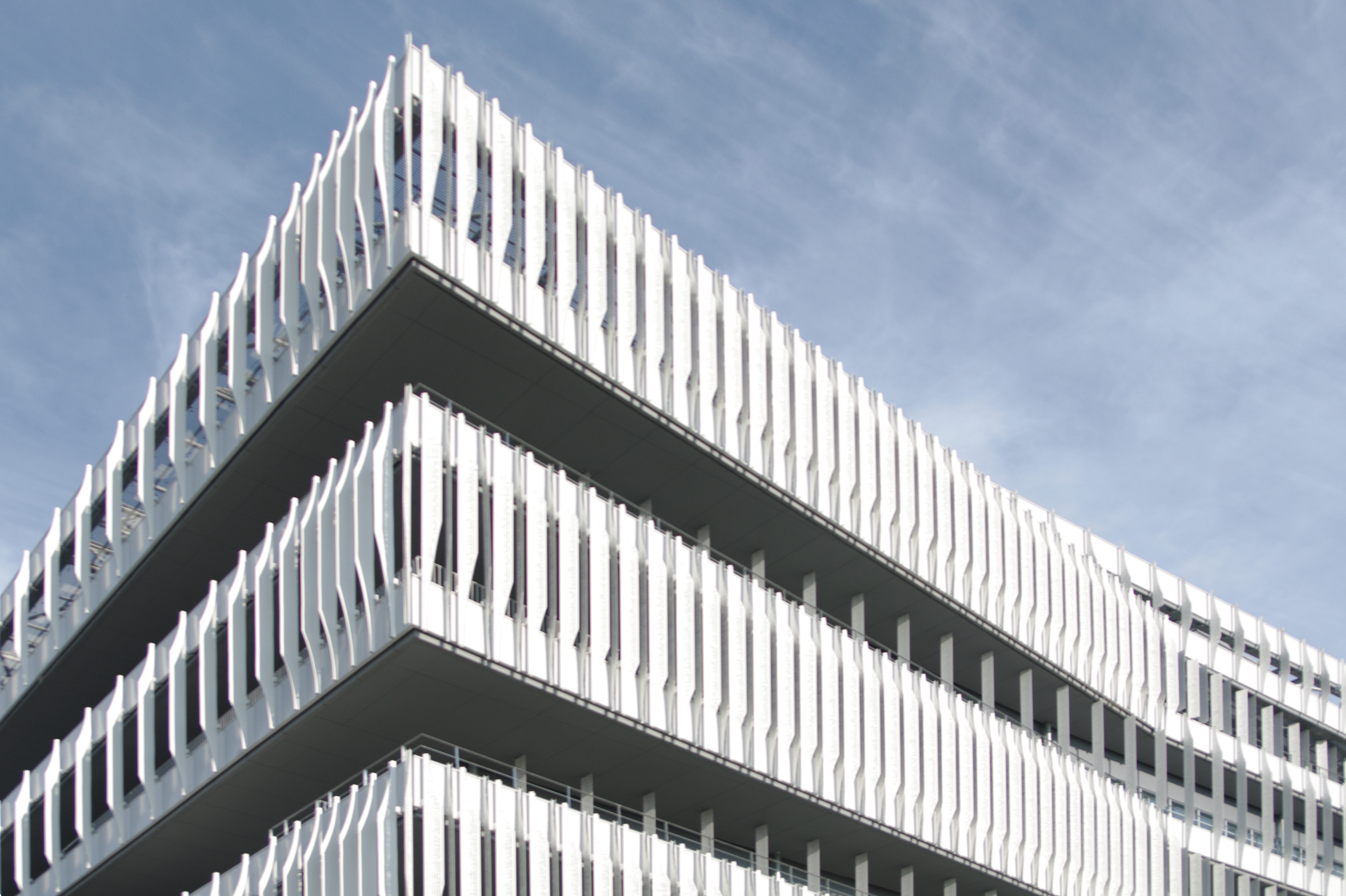 최첨단 환경 시뮬레이션을 통해 일사 부하 저감을 최적화한 독특한 루버 라이트 자동차 디자인 기법의 캐릭터 라인에서 착안한 형태로모빌리티 기업에 걸맞은 미래지향성과 기능성을 동시에 상징하며 최적의 환경 성능을 보유하는 아이코닉한 외관을 구현한다특히 해질녘의 일사가 심한 정면 파사드는 발코니의 돌출 깊이세로 루버의 배치 밀도와 각도형태를 대상으로, 컴퓨테이셔널 디자인을 활용하여 만들어 낸 수많은 패턴 중에서 최적의 해법을 도출하였다라이트 윙에는 펀칭 개구를 적용해 자연광을 실내로 확산시키고 눈부심을 저감하여쾌적한 시환경을 확보하도록 계획했다.