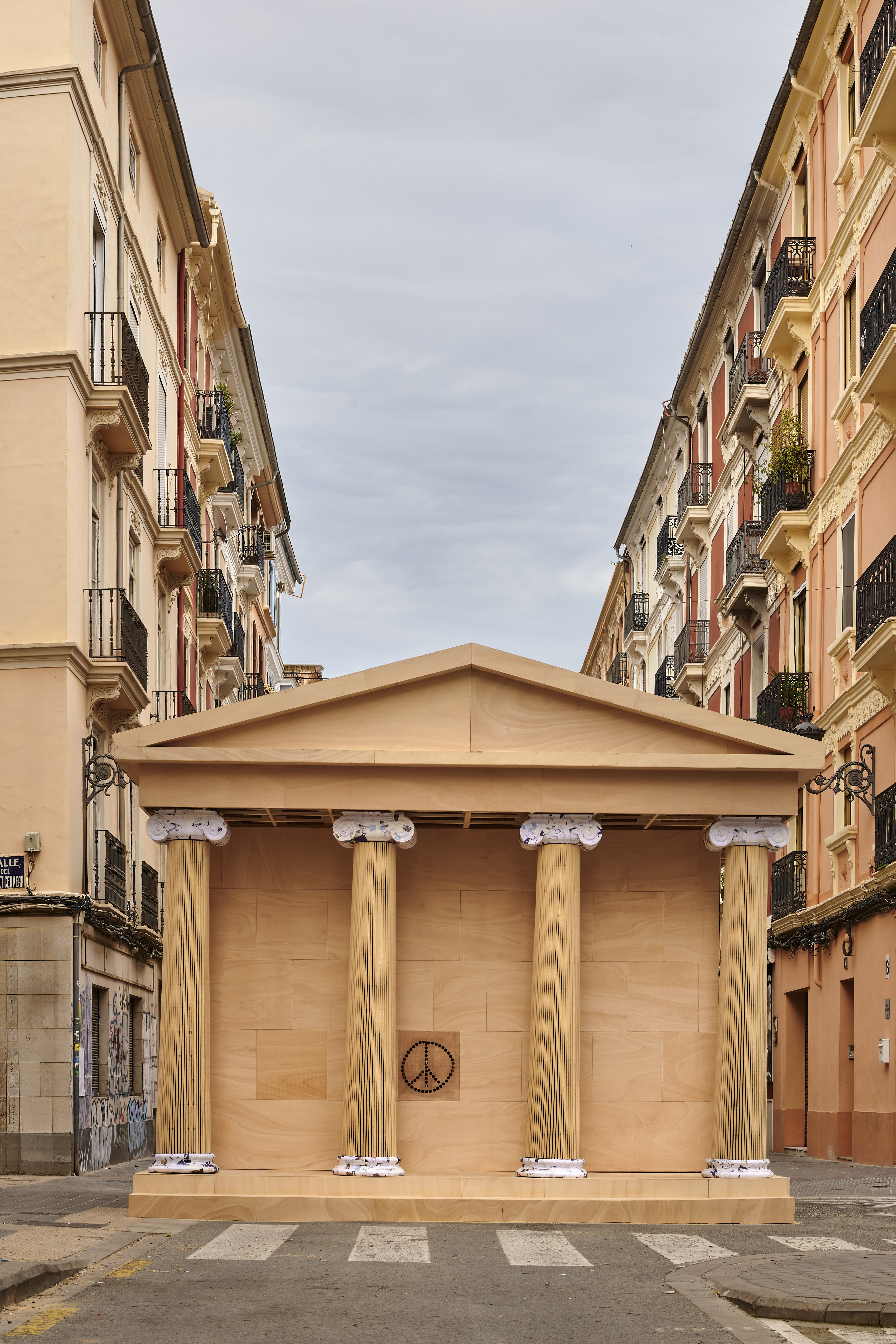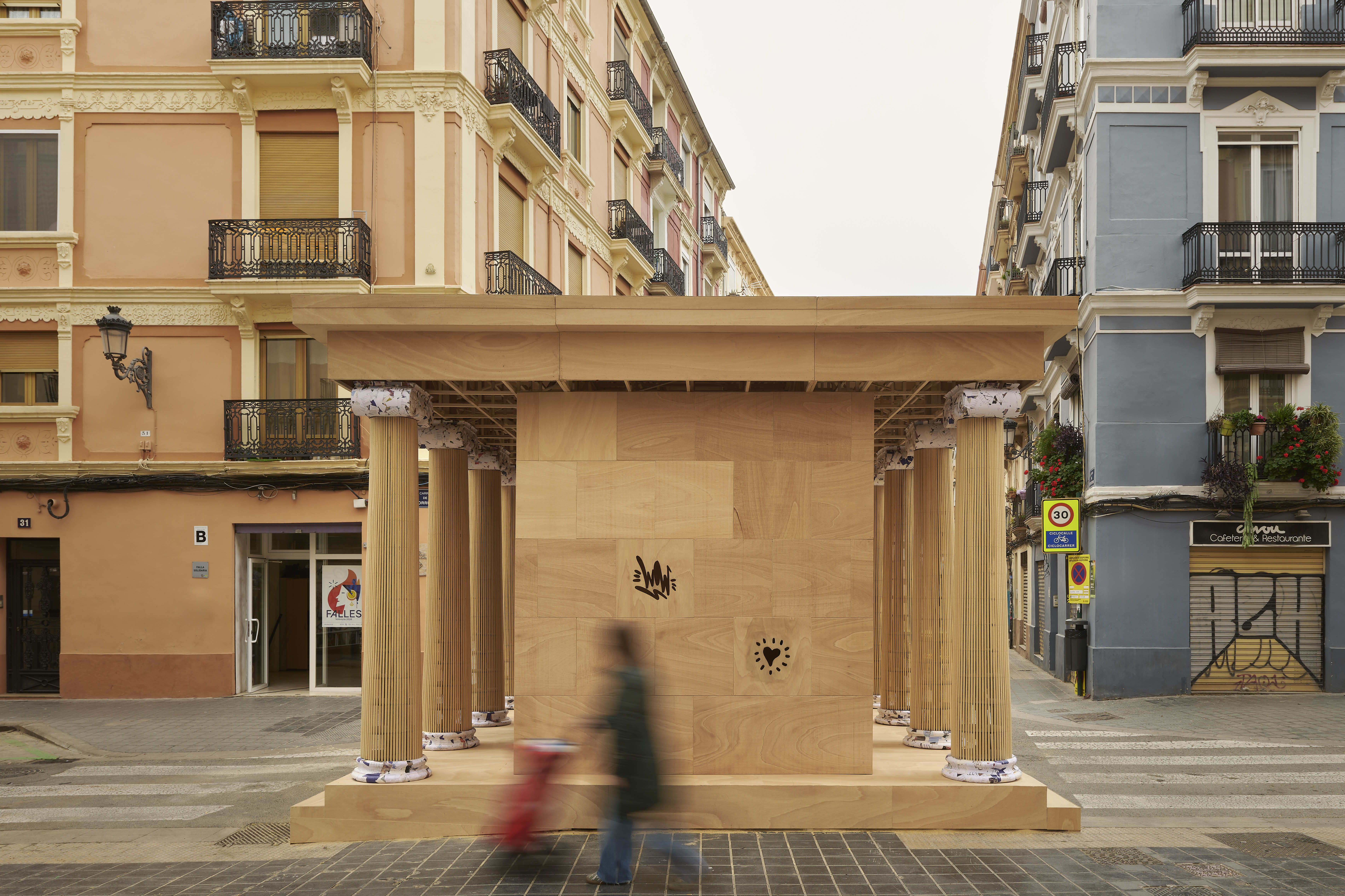 스페인 스트리트 아트 듀오 피치아보(PichiAvo)는 2026년 발렌시아의 전통 축제 ‘파야스(Fallas de Valencia)’를 위해 기념비적인 파빌리온 프로젝트를 선보였다. 작품의 제목은 “Per ofrenar”(To Offer)로, 이 구조물은 축제의 마지막 의식인 ‘라 크레마(La Cremà)’에서 불태워지기 전까지 단 며칠 동안만 존재했다.