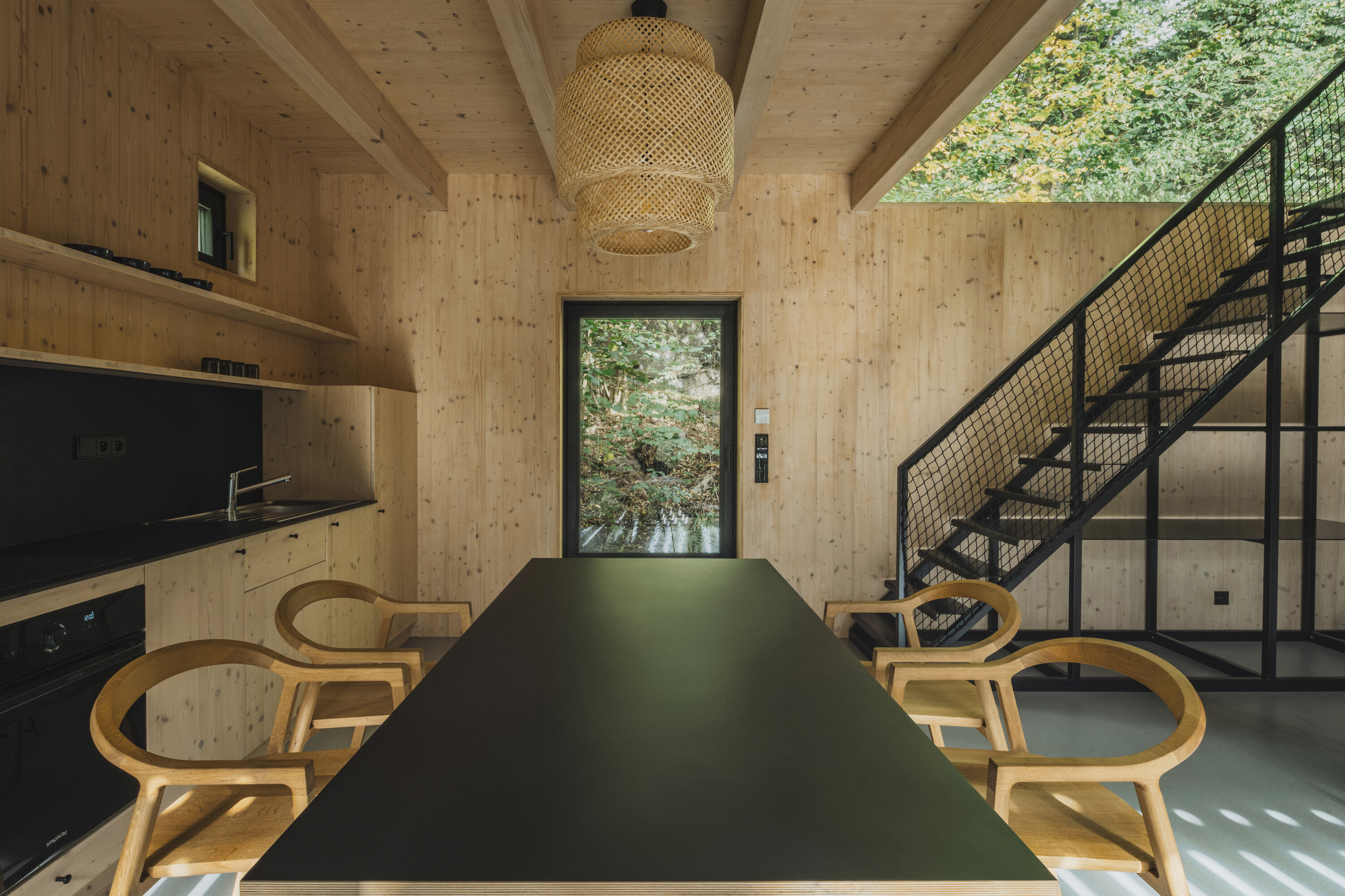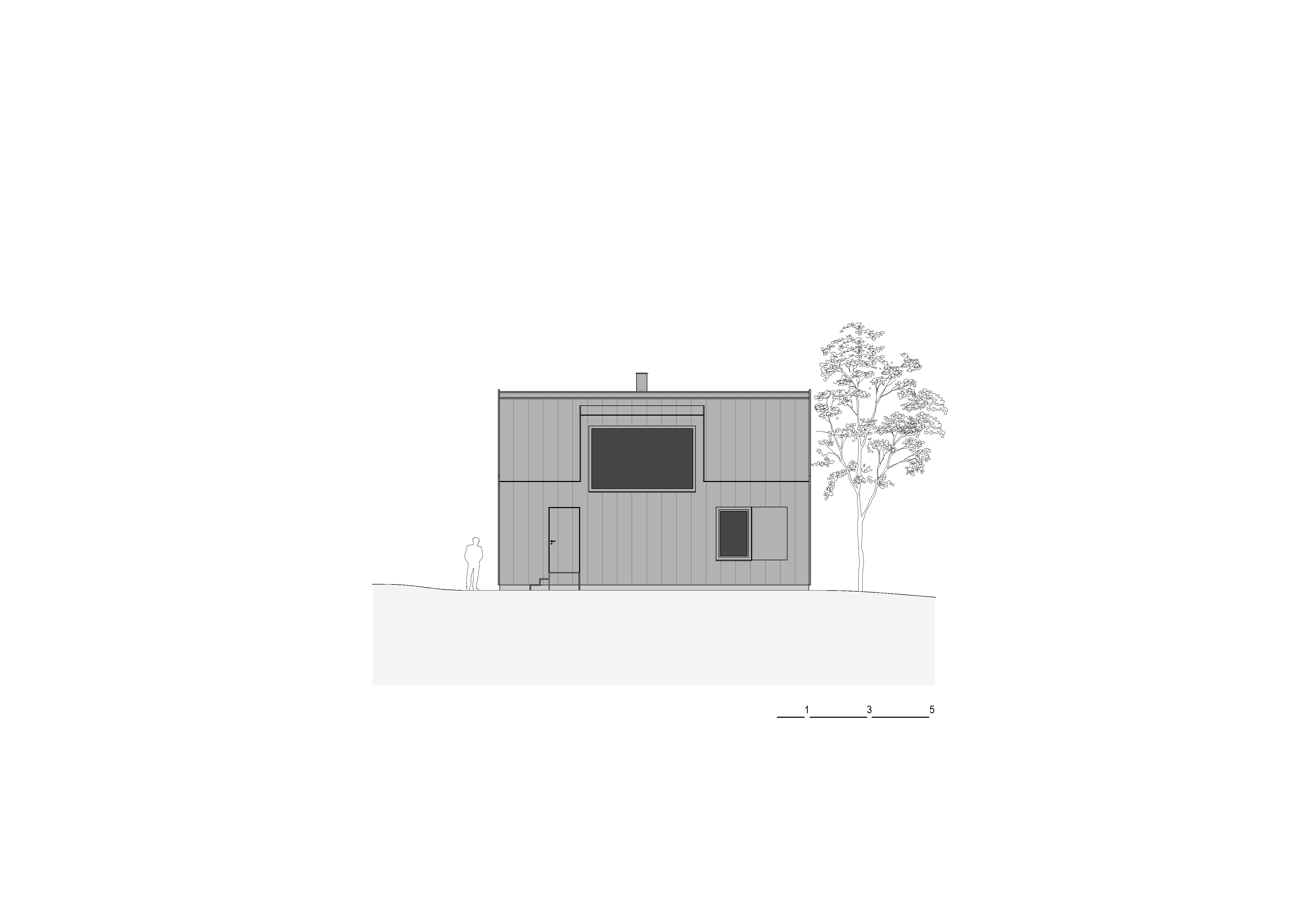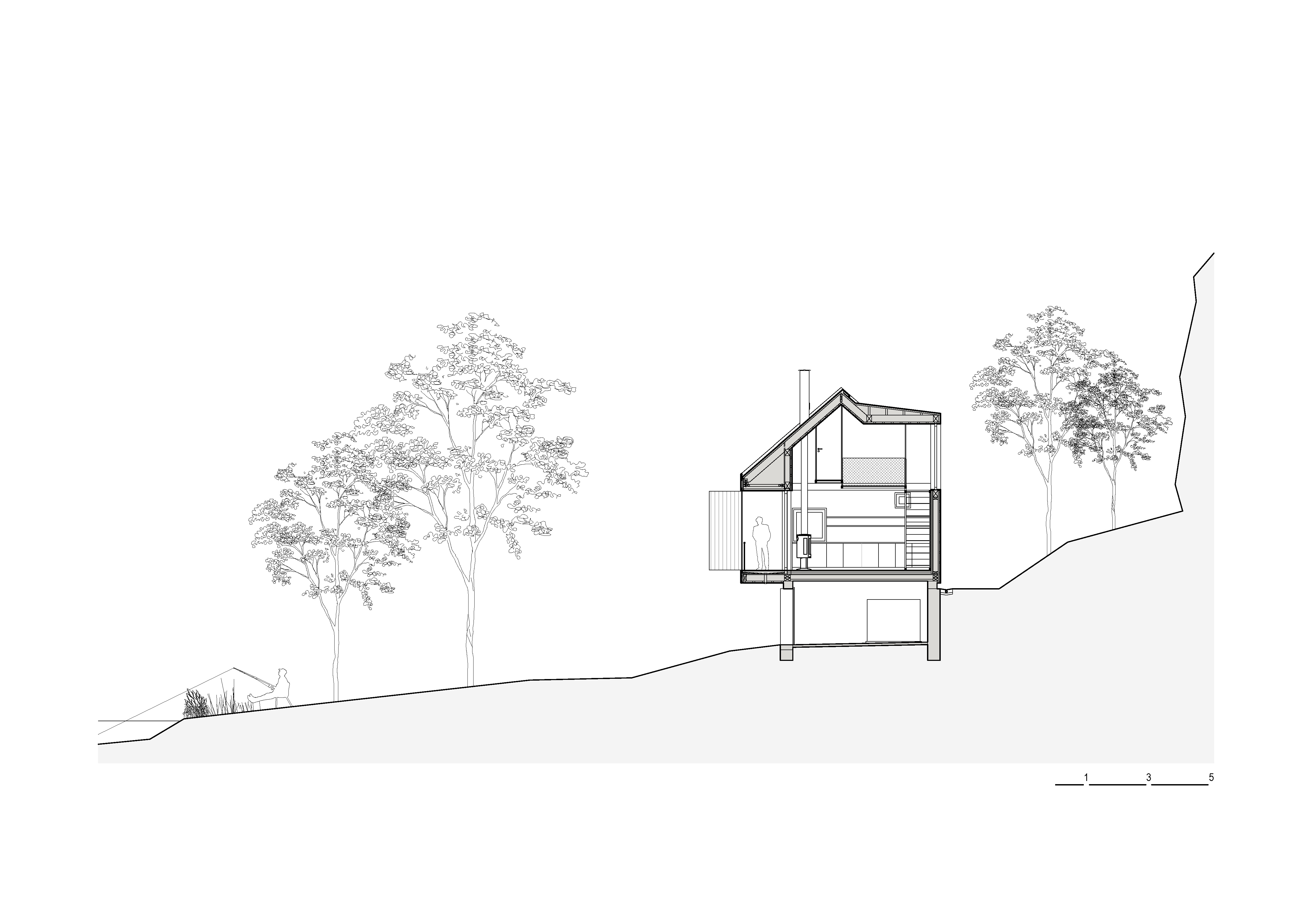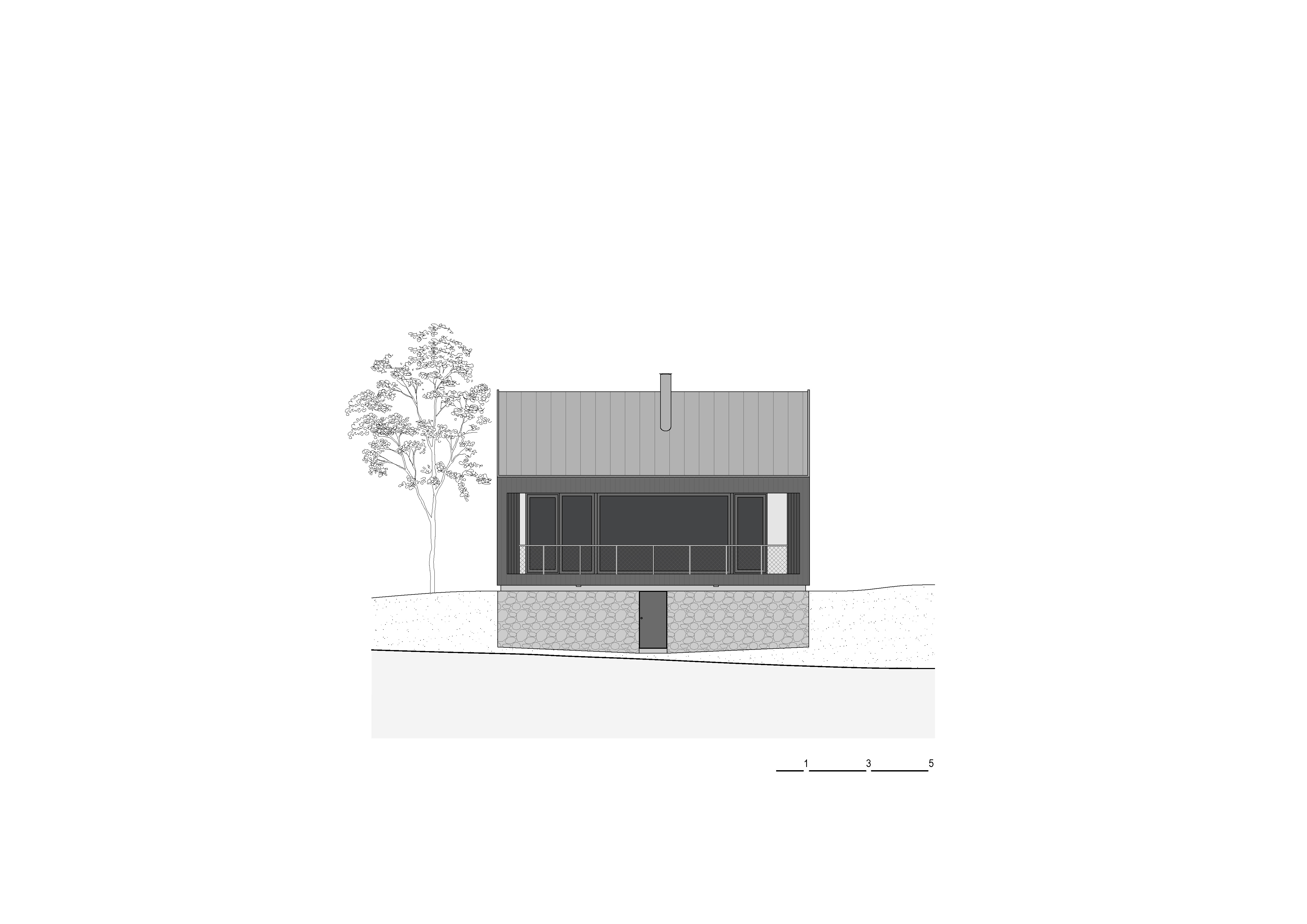 사자바(Sázava) 강변에 자리한 이 오두막은 화재로 소실된 기존 건물을 대체해 같은 자리에 새롭게 세워졌다. 불길 이후 남은 것은 단단한 석조 기단뿐이었다. 새 건축물은 이 기단을 자연스럽게 흡수하며, 홍수로부터 보호 기능을 확보하는 동시에 강을 향한 조망의 기반으로 삼았다. 기단 위에 선 오두막은 일상의 속도를 잠시 멈추게 하는 장치처럼 작동한다.