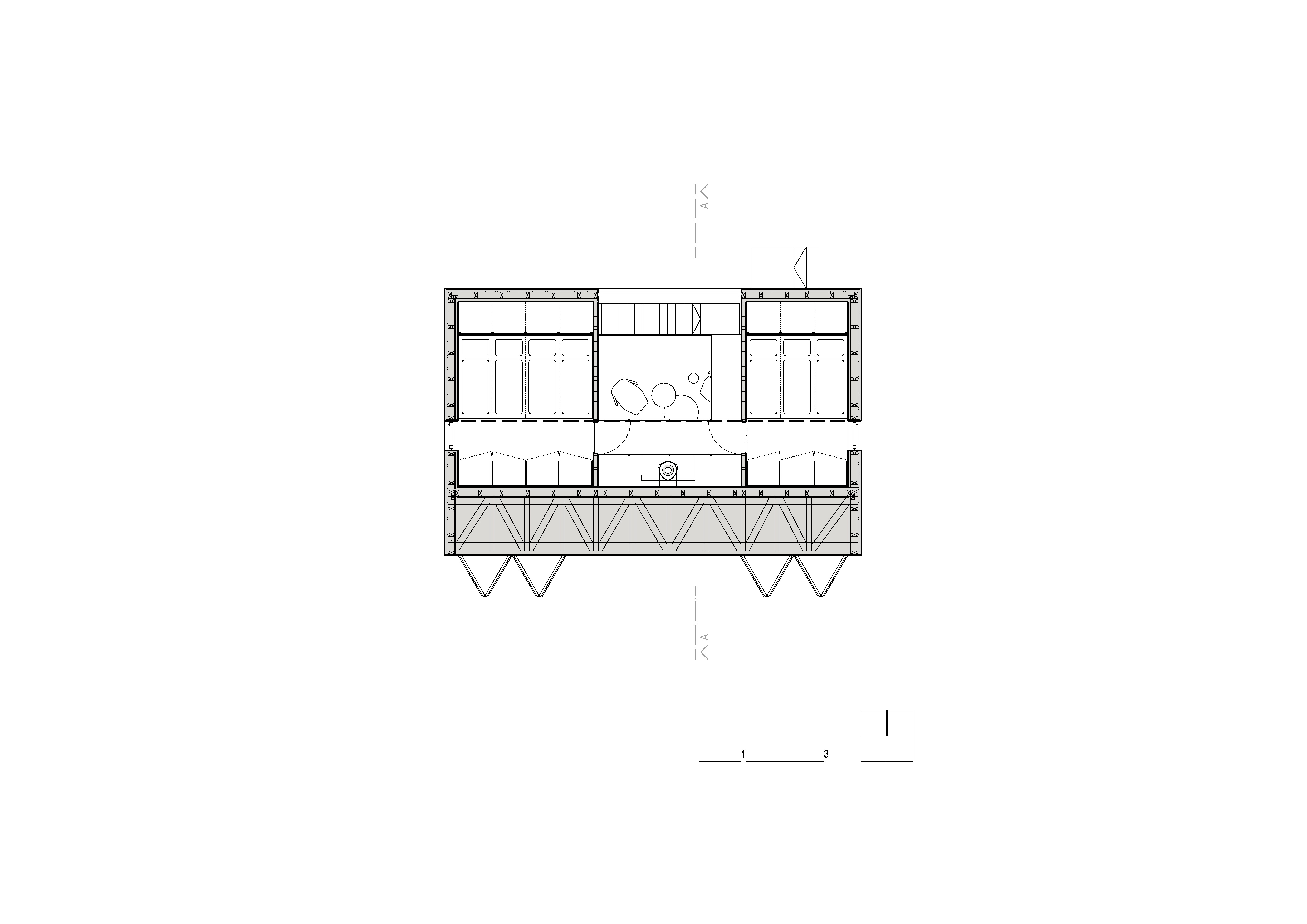 1층의 메인 공간은 복층 높이로 계획되어 강과 절벽을 연결하는 공간처럼 보인다. 전면은 유리로 열려 있으며, 테라스를 통해 강을 향해 확장되는 모양이다. 이 테라스는 폴딩도어로 닫을 수 있어, 여름 햇빛을 차단하거나 사용하지 않는 기간에는 외부로부터 완전히 차단된 건물로 사용할 수 있다.