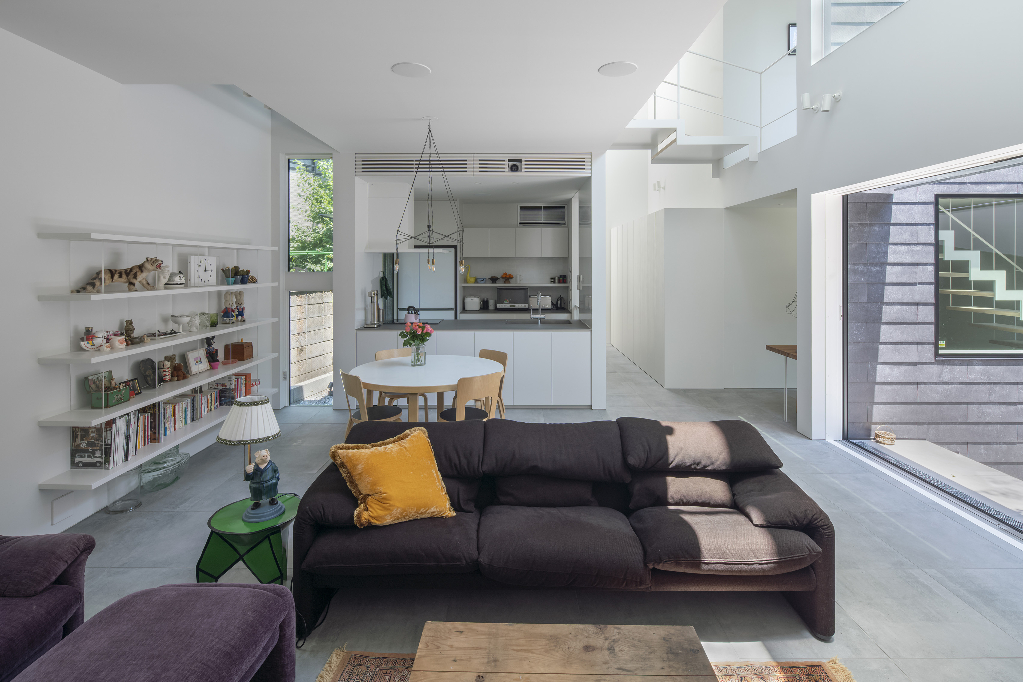 The volumes follow the gently sloping topography with altering ceiling heights and emphasize the expansive horizontal depth at both levels. Uninterrupted views within the house are maximized in distance as this helps the feel of being in an ‘internal landscape’. A rooflight and an automated side-window form a ‘chimney’ that is positioned at the top of each ‘box’, which bring ever-changing natural light and flowing air into the dwelling. Shadows that respond to the seasons and climate inter-play with the sense of depth within the continuous internal environment. An external approach to the living emerges when the shutter to the garage is open, creating a buffer between the city and the private space.