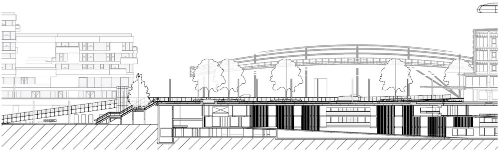 The Utrecht Central station area is currently undergoing a major makeover. By healing the scars left behind by a number of ‘modernizations’ carried out in the sixties and seventies and adding new functions to the area this part of Utrecht is designated to finally become a vibrant and friendly part of the city centre. To achieve this, inner city highways are being replaced by more modest streets and historic canals are being restored. Also, the huge modernist megastructure that once glued together the railway station and the Hoog Catharijne shopping mall (both the biggest of their kind in the Netherlands) has been taken apart, allowing for a new public street and square to be inserted, together with a bicycle parking garage. This new “Stationsallee”, a street aimed mainly at pedestrians rises by means of 30 meter wide starircases, to a level of 6 meters to widen into a square where the entrances of both the station and the shopping mall are situated. An enormous iconic canopy marks the square and enables a dry crossing between the parts that before have always been connected.