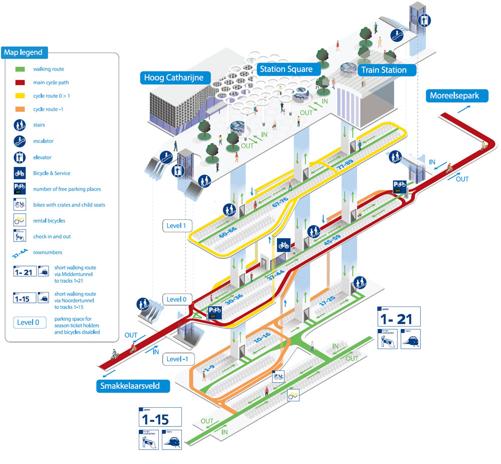 3층짜리 자전거 주차장은 광장 아래 위치해 있다. 이는 편의성, 속도 그리고 안전이라는 세 가지 목표를 기반으로 두고 설계되었다. 이러한 규모의 시설에서 이를 이루기 위해서는 사이클리스트들이 그들의 주차장까지 페달을 밟고 올라 갈 수 있어야 한다. 주차 차선은 사용자가 시스템을 통과하는 자전거 사용자를 방해하지 않도록 하기 위해 사이클 경로에서 분기된다. 자전거 전용 차선을 따라 오르막 및 내리막 공간이 남아 있다. 적당히 경사진 경사로가 여러 층의 주차 구역을 연결한다. 벽은 경로를 나타내기 위해 색상으로 구분되며, 전자 신호는 무료 주차 슬롯의 위치를 나타낸다. 자전거 수리점, 자전거 대여점과 같은 추가 시설 및 여러 명의 층 별 관리인들은 사용자의 모든 요구를 충족 시킨다.
