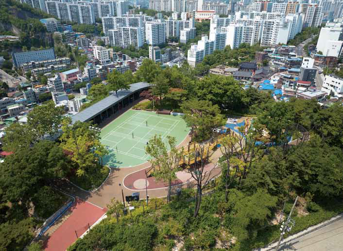 Sungin Park Playground is located on the upper part of a former quarry. In order to realize an integrated and generation-friendly playground, a sky gym for seniors was built around the border with a panoramic view of Seoul, and various exercise equipment was placed after gathering opinions from residents. In addition, the narrow play area, which was previously composed of playground equipment, was expanded to start at the entrance of the access road, encouraging various play activities for children. It includes elements that can become a local attraction, with an open library within the park and an observation deck overlooking Namsan Mountain and the landscape.