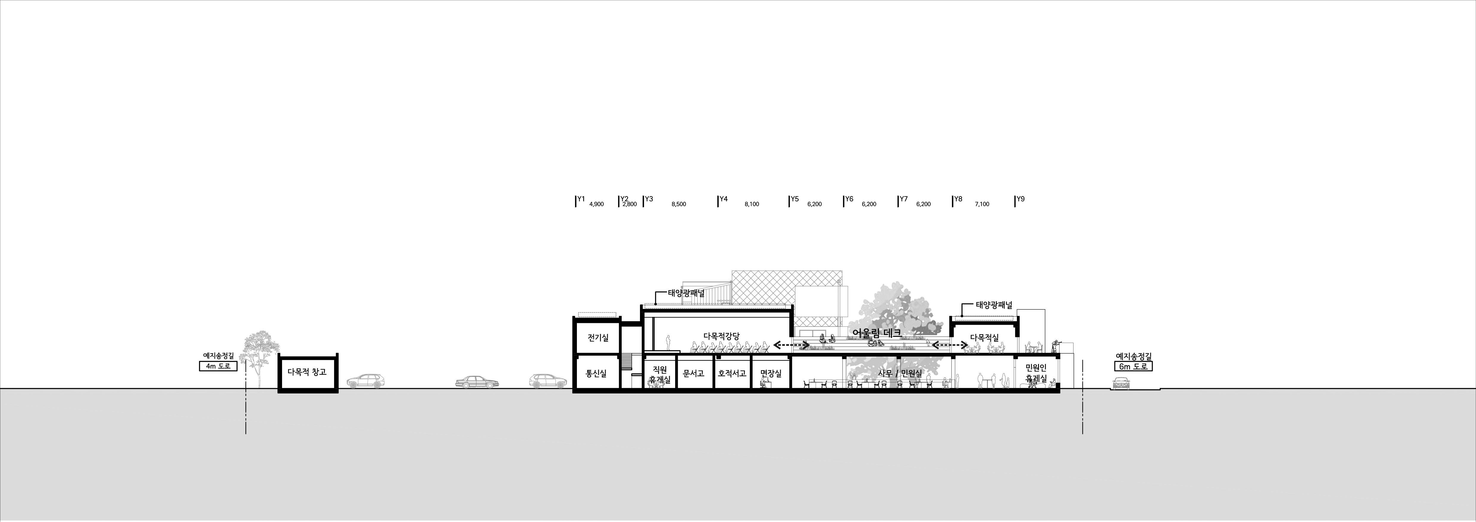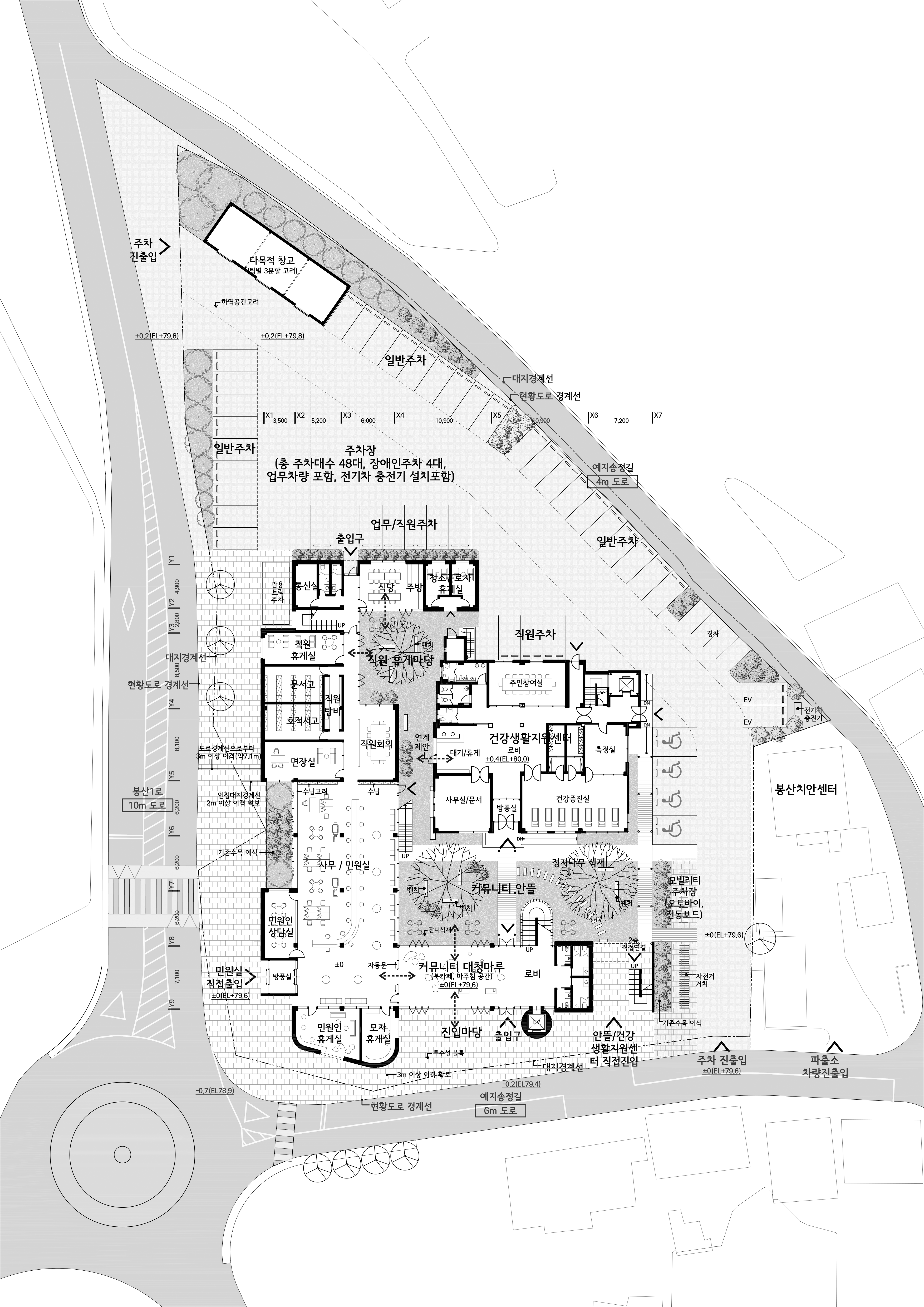 이러한 안뜰 중심의 새로운 건물 클러스터와 구분되는 대지 북측 긴 변을 따라서 주차장과 편리한 통과차로가 형성된다. 대지 크기의 잠재성을 활용하여 기존 주차대수 이상의 충분한 주차장 확보로 면 지역 이용 편의성과 자전거와 모빌리티 사용을 함께 고려하되, 보행동선과 겹치지 않도록 조성된다. 전체건물은 공사비를 고려하여 지하층 없이 간결한 지상2층으로만 구성된다. 또한 기존 면사무소를 공사중에도 사용할 수 있게 하는 배치계획으로, 전체 사업비 절감과 주민이용 연속성의 이점도 염두에 두었다.