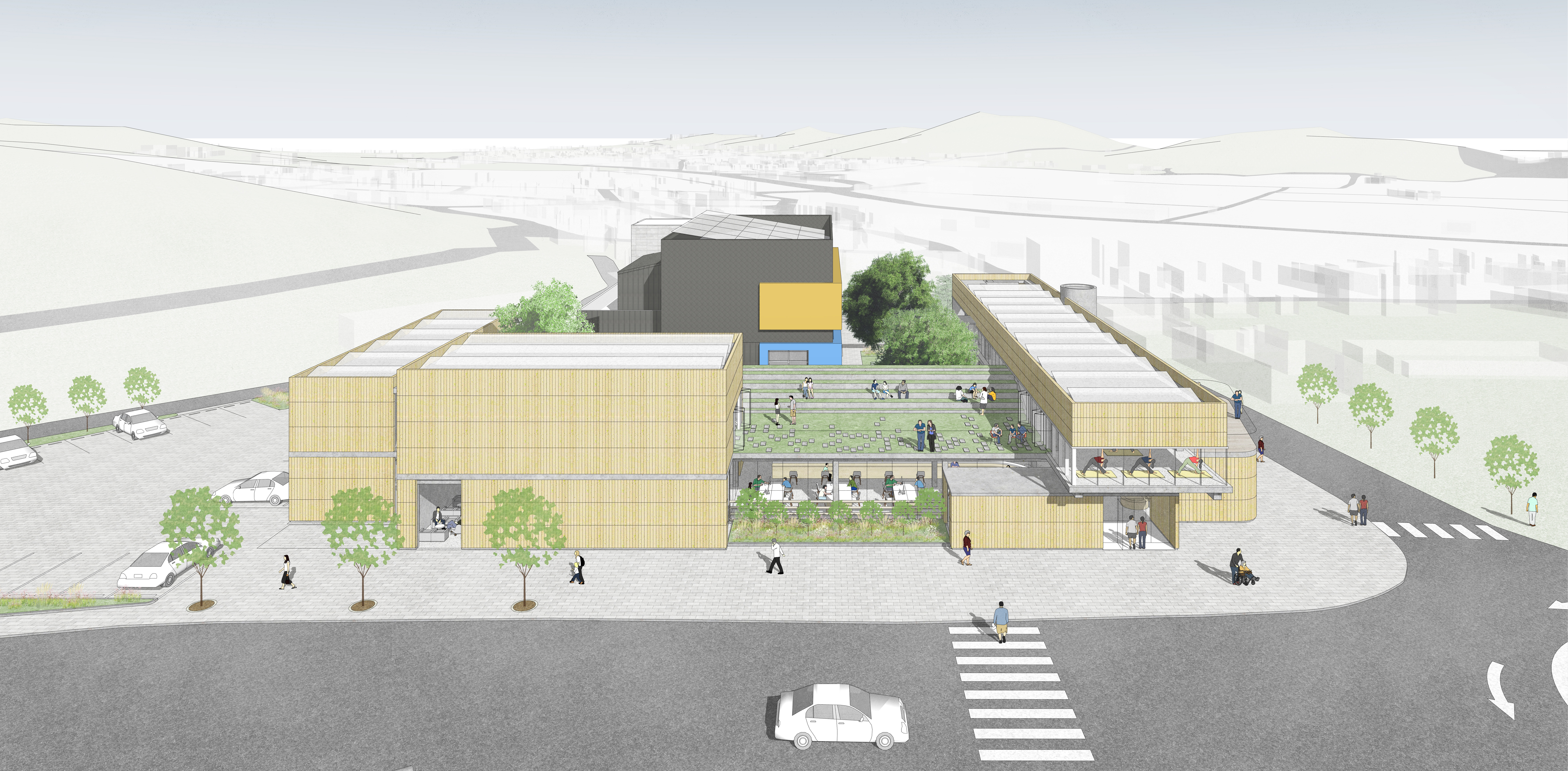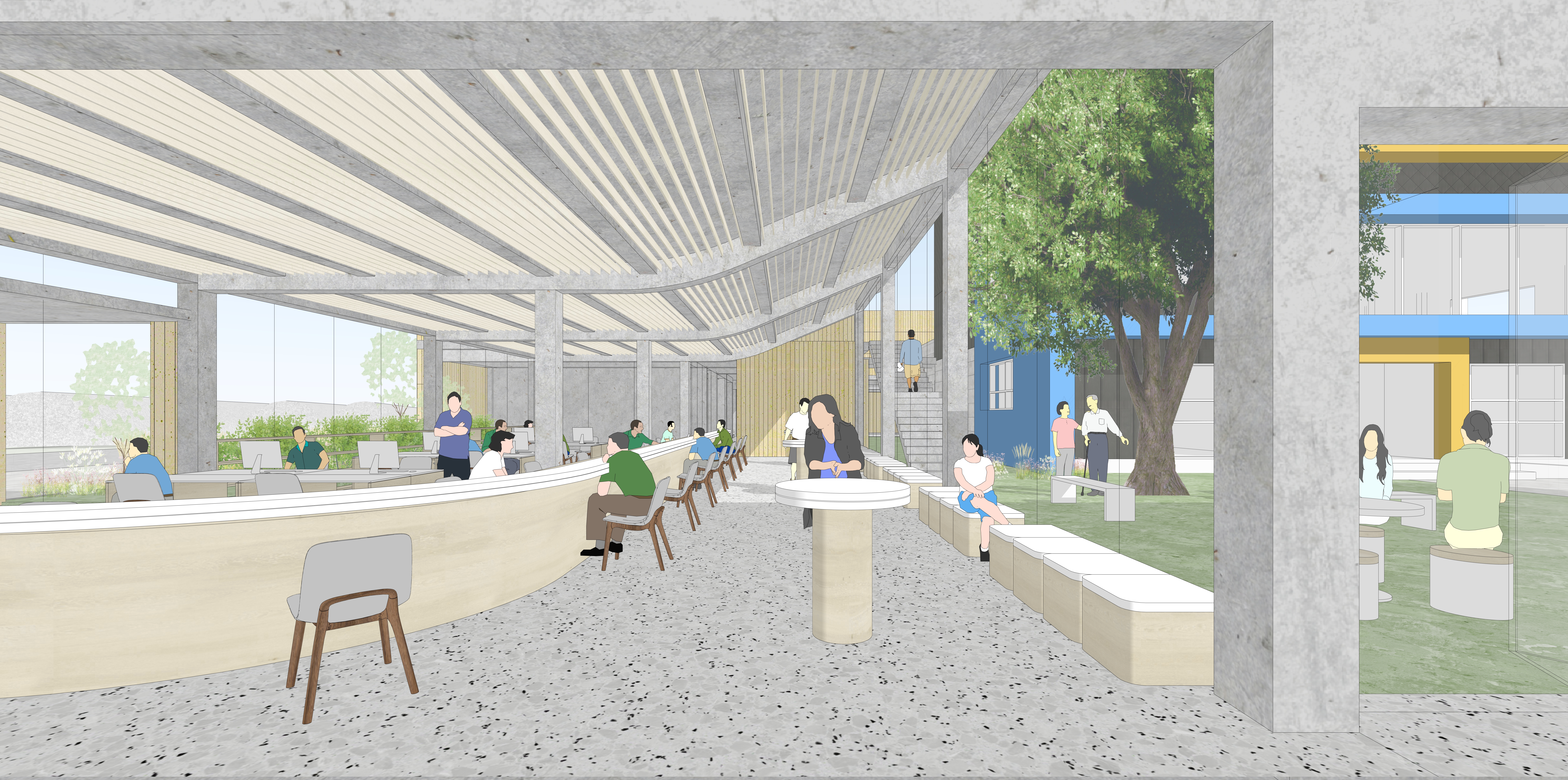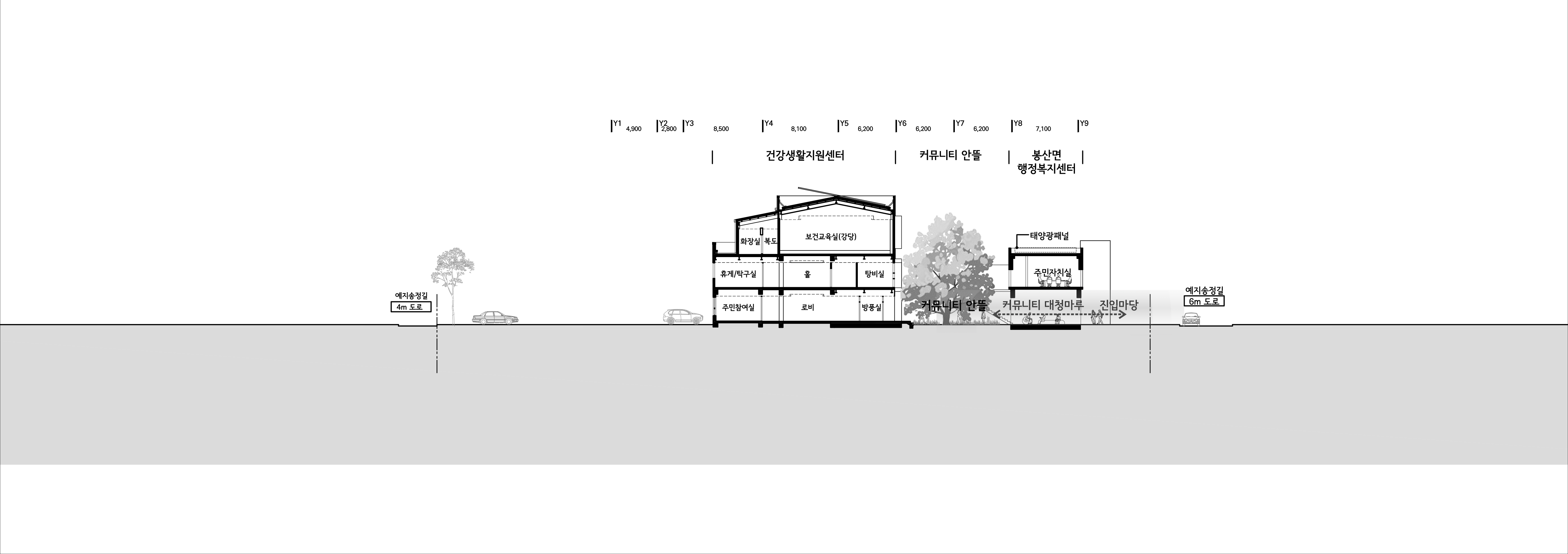 이제 봉산면 행정복지센터는 남겨질 건강생활지원센터 건물과 함께 대지 전체가 갖고 있는 물리적 크기의 장점을 살리되, 면 전체 커뮤니티의 일상이 공유되는 새로운 장소로 만들어져야 한다. 이를 위해, 먼저 새로운 면사무소의 앉음새는 기존 건물과 함께 공동체 모두의 말랑말랑한 안마당인 ‘커뮤니티 안뜰’을 만들어 내는 방식으로 시작된다. 이 안뜰은 예지리 마을을 포함한 면 전체 공동체의 상징적 안마당이자 언제든 편히 쉬어갈 수 있는 부드러운 외부공간으로 작동할 것이다. 한편 안뜰은 그 세부적 위치에 따라 진입부와의 자연스런 경계가 되기도 하고 직원들의 호젓한 쉼 공간이 되기도 한다.